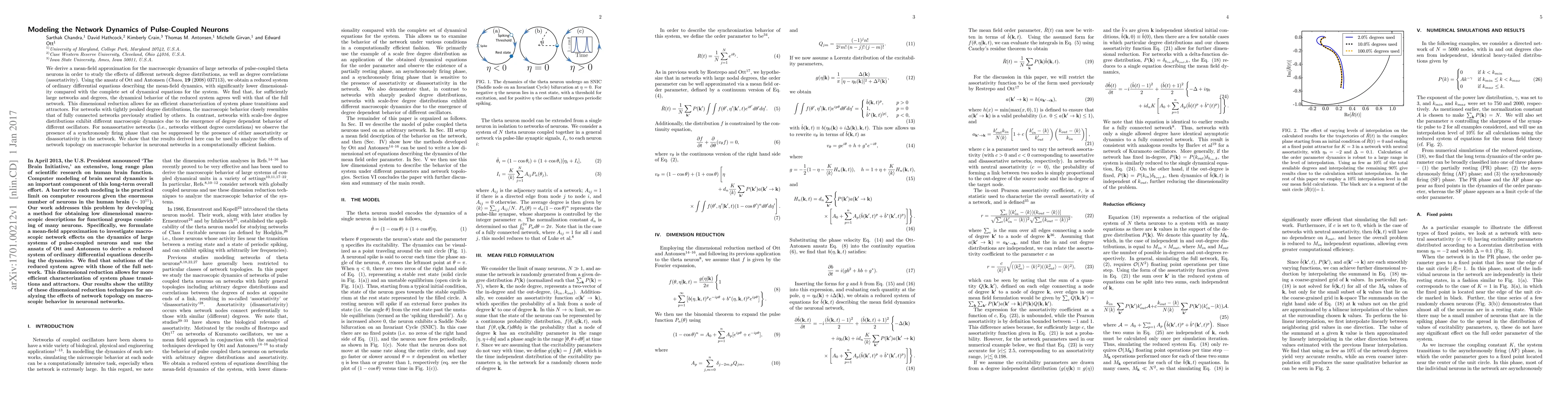 We derive a mean-field approximation for the macroscopic dynamics of large networks of pulse-coupled theta neurons in order to study the effects of different network degree distributions, as well as degree correlations (assortativity). Using the ansatz of Ott and Antonsen (Chaos, 19 (2008) 037113), we obtain a reduced system of ordinary differential equations describing the mean-field dynamics, with significantly lower dimensionality compared with the complete set of dynamical equations for the system. We find that, for sufficiently large networks and degrees, the dynamical behavior of the reduced system agrees well with that of the full network. This dimensional reduction allows for an efficient characterization of system phase transitions and attractors. For networks with tightly peaked degree distributions, the macroscopic behavior closely resembles that of fully connected networks previously studied by others. In contrast, networks with scale-free degree distributions exhibit different macroscopic dynamics due to the emergence of degree dependent behavior of different oscillators. For nonassortative networks (i.e., networks without degree correlations) we observe the presence of a synchronously firing phase that can be suppressed by the presence of either assortativity or disassortativity in the network. We show that the results derived here can be used to analyze the effects of network topology on macroscopic behavior in neuronal networks in a computationally efficient fashion.