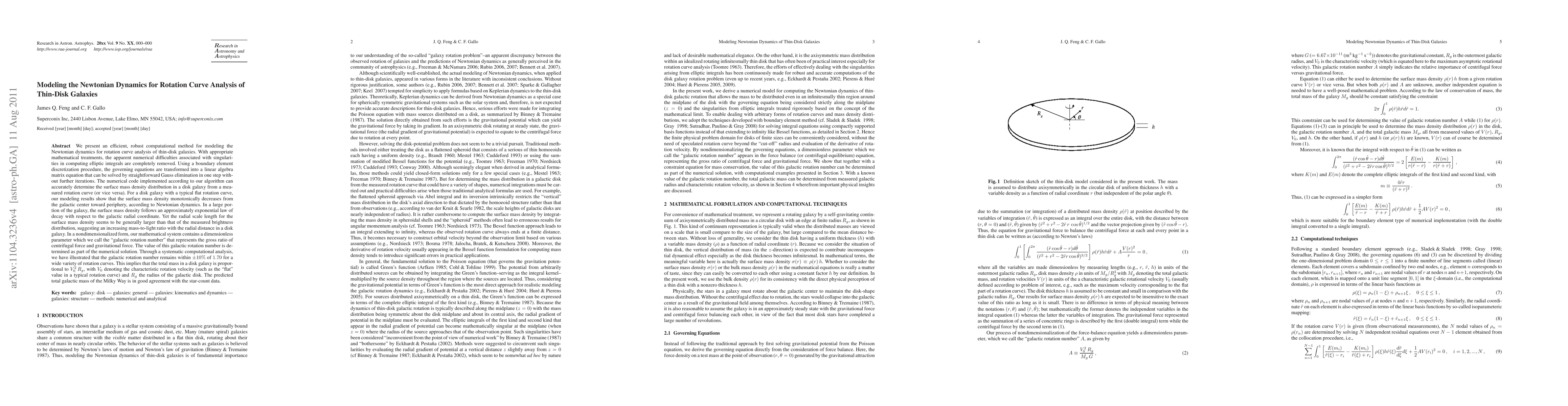 We present an efficient, robust computational method for modeling the Newtonian dynamics for rotation curve analysis of thin-disk galaxies. For a disk galaxy with a typical flat rotation curve, our modeling results show that the surface mass density monotonically decreases from the galactic center toward periphery, according to Newtonian dynamics. In a large portion of the galaxy, the surface mass density follows an approximately exponential law of decay with respect to the galactic radial coordinate. Yet the radial scale length for the surface mass density seems to be generally larger than that of the measured brightness distribution, suggesting an increasing mass-to-light ratio with the radial distance in a disk galaxy. In a nondimensionalized form, our mathematical system contains a dimensionless parameter which we call the "galactic rotation number" that represents the gross ratio of centrifugal force and gravitational force. The value of this galactic rotation number is determined as part of the numerical solution. Through a systematic computational analysis, we have illustrated that this galactic rotation number remains within $\pm 10%$ of 1.70 for a wide variety of rotation curves. This implies that the total mass in a disk galaxy is proportional to $V_0^2\,R_g$, with $V_0$ denoting the characteristic rotation velocity and $R_g$ the radius of the galactic disk. The predicted total galactic mass of the Milky Way is in good agreement with the star-count data.