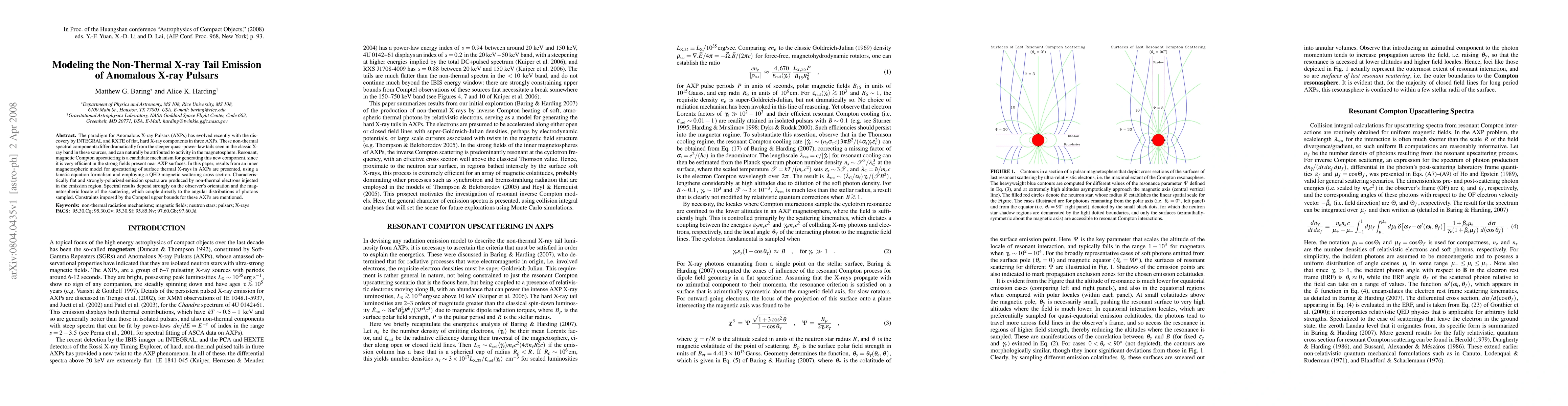 This paper models the non-thermal X-ray tail emission in Anomalous X-ray Pulsars (AXPs) using resonant magnetic Compton upscattering in the inner magnetosphere, predicting flat, polarized spectra dependent on observer orientation and scattering location. The study employs a kinetic equation formalism and QED magnetic scattering cross section.
