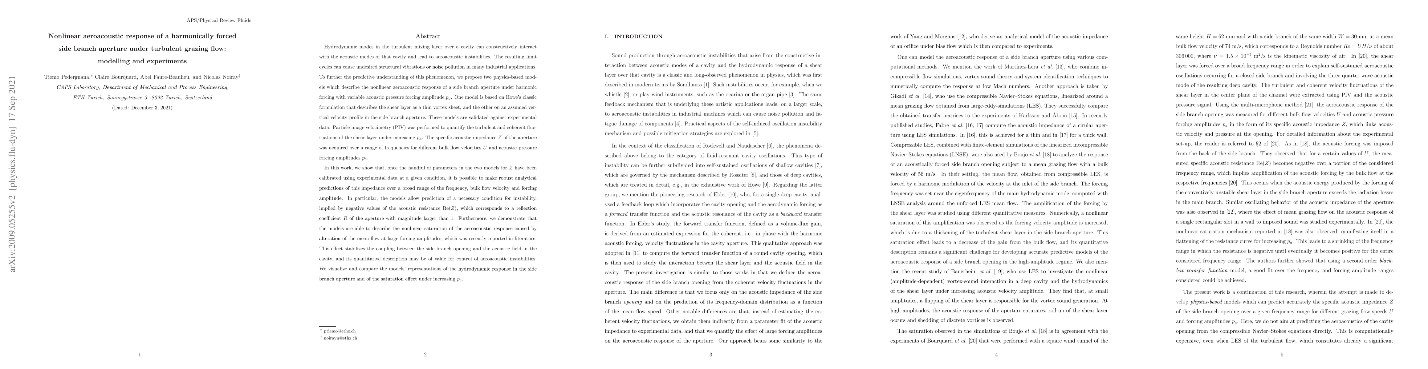 Hydrodynamic modes in the turbulent mixing layer over a cavity can constructively interact with the acoustic modes of that cavity and lead to aeroacoustic instabilities. The resulting limit cycles can cause undesired structural vibrations or noise pollution in many industrial applications. To further the predictive understanding of this phenomenon, we propose two physics-based models which describe the nonlinear aeroacoustic response of a side branch aperture under harmonic forcing with variable acoustic pressure forcing amplitude pa. One model is based on Howe's classic vortex sheet formulation, and the other on an assumed vertical velocity profile in the side branch aperture. These models are validated against experimental data. Particle image velocimetry (PIV) was performed to quantify the turbulent and coherent fluctuations of the shear layer under increasing pa. The specific acoustic impedance Z of the aperture was acquired over a range of frequencies f for different bulk flow velocities U and acoustic pressure forcing amplitudes pa. We show that, once the handful of parameters in the two models for Z have been calibrated using experimental data at a given condition, it is possible to make robust analytical predictions of this impedance over a broad range of f, U and pa. In particular, the models allow prediction of a necessary condition for instability, implied by negative values of the acoustic resistance Re(Z). Furthermore, we demonstrate that the models are able to describe the nonlinear saturation of the aeroacoustic response caused by alteration of the mean flow at large forcing amplitudes, which was recently reported in literature. This effect stabilizes the coupling between the side branch opening and the acoustic field in the cavity, and its quantitative description may be of value for control of aeroacoustic instabilities.