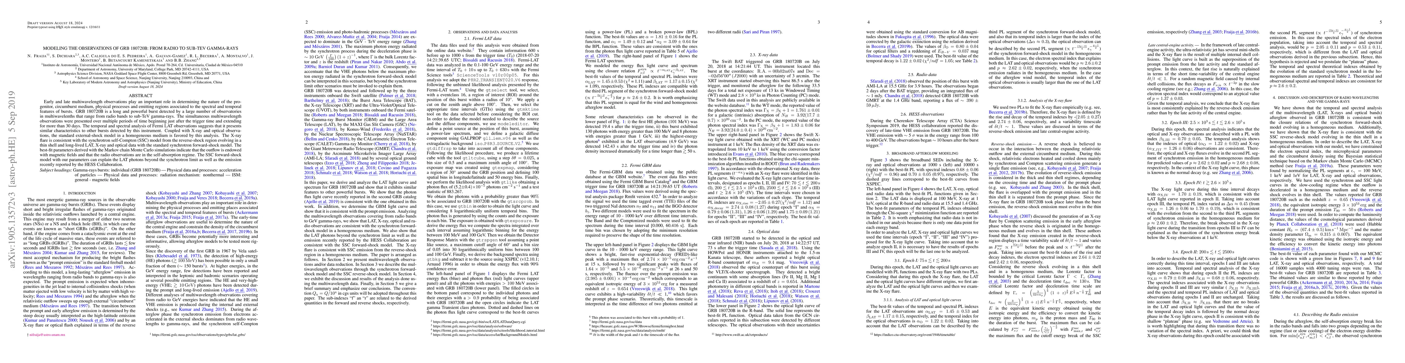 Early and late multiwavelength observations play an important role in determining the nature of the progenitor, circumburst medium, physical processes and emitting regions associated to the spectral and temporal features of bursts. GRB 180720B is a long and powerful burst detected by a large number of observatories in multiwavelenths that range from radio bands to sub-TeV gamma-rays. The simultaneous multiwavelength observations were presented over multiple periods of time beginning just after the trigger time and extending for more than 30 days. The temporal and spectral analysis of Fermi LAT observations suggests that it presents similar characteristics to other bursts detected by this instrument. Coupled with X-ray and optical observations, the standard external-shock model in a homogeneous medium is favored by this analysis. The X-ray flare is consistent with the synchrotron self-Compton (SSC) model from the reverse-shock region evolving in a thin shell and long-lived LAT, X-ray and optical data with the standard synchrotron forward-shock model. The best-fit parameters derived with the Markov chain Monte Carlo simulations indicate that the outflow is endowed with magnetic fields and that the radio observations are in the self-absorption regime. The SSC forward-shock model with our parameters can explain the LAT photons beyond the synchrotron limit as well as the emission recently reported by the HESS Collaboration.