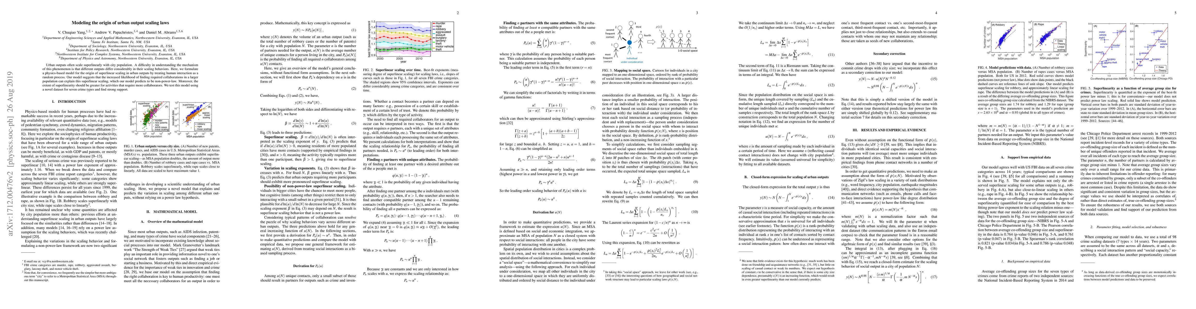 This paper proposes a physics-based model explaining how urban outputs scale superlinearly with city population, suggesting that collaboration is key to this phenomenon. The model predicts non-power-law scaling, which was tested using crime data and found strong support.