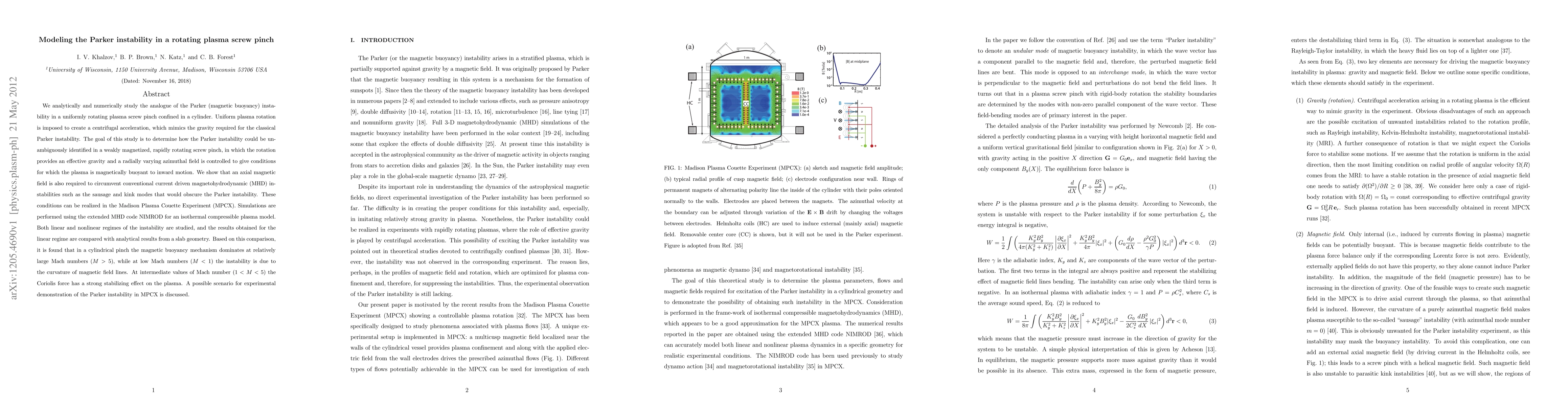 Researchers model Parker instability in a rotating plasma screw pinch, finding that magnetic buoyancy dominates at large Mach numbers, while curvature of magnetic field lines and Coriolis force stabilize the plasma at low to intermediate Mach numbers.