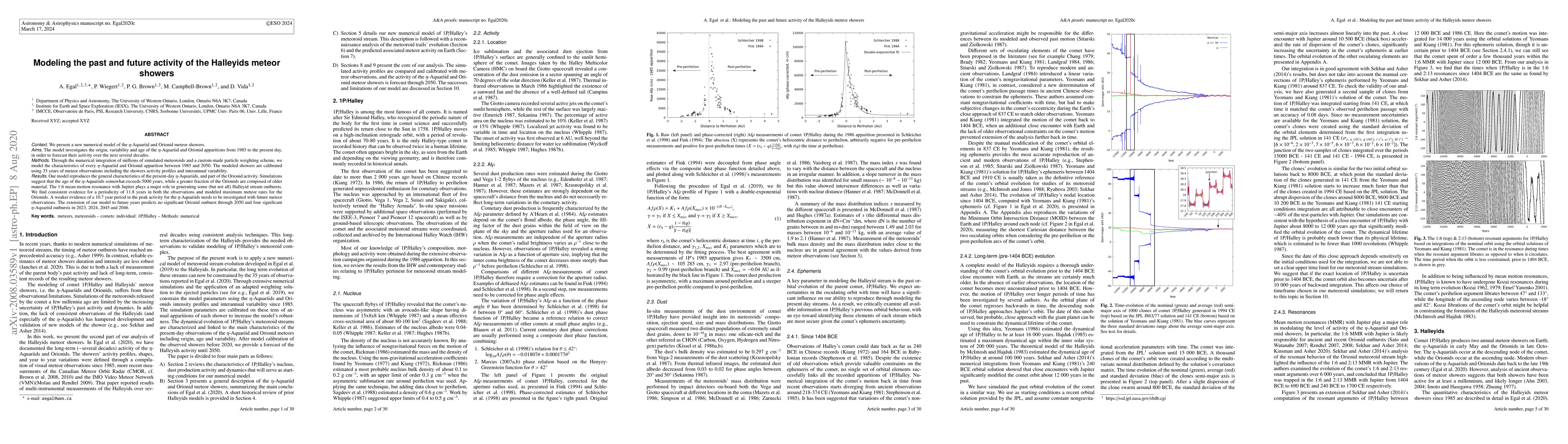 This research paper presents a new model for predicting eta-Aquariid and Orionid meteor showers' activity from 1985 to 2050, suggesting the etuids may be over 5000 years old and indicating no significant Orionids outbursts until 2046.