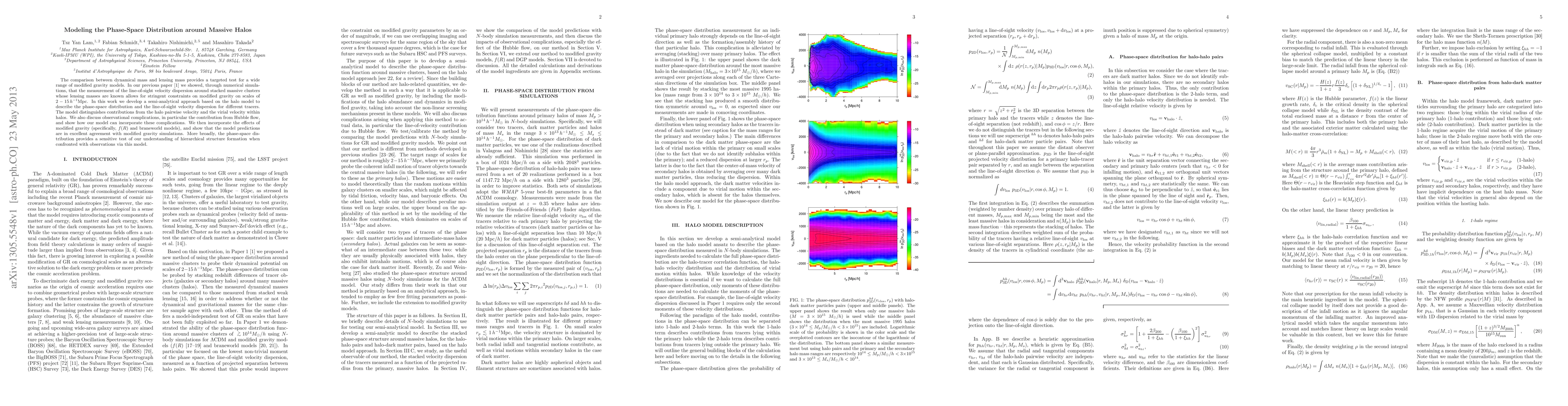 The comparison between dynamical mass and lensing mass provides a targeted test for a wide range of modified gravity models. In our previous paper we showed, through numerical simulations, that the measurement of the line-of-sight velocity dispersion around stacked massive clusters whose lensing masses are known allows for stringent constraints on modified gravity on scales of 2 - 15 Mpc/h. In this work we develop a semi-analytical approach based on the halo model to describe the phase-space distribution and the line-of-sight velocity dispersion for different tracers. The model distinguishes contributions from the halo pairwise velocity and the virial velocity within halos. We also discuss observational complications, in particular the contribution from Hubble flow, and show how our model can incorporate these complications. We then incorporate the effects of modified gravity (specifically, f(R) and braneworld models), and show that the model predictions are in excellent agreement with modified gravity simulations. More broadly, the phase-space distribution provides a sensitive test of our understanding of hierarchical structure formation when confronted with observations via this model.