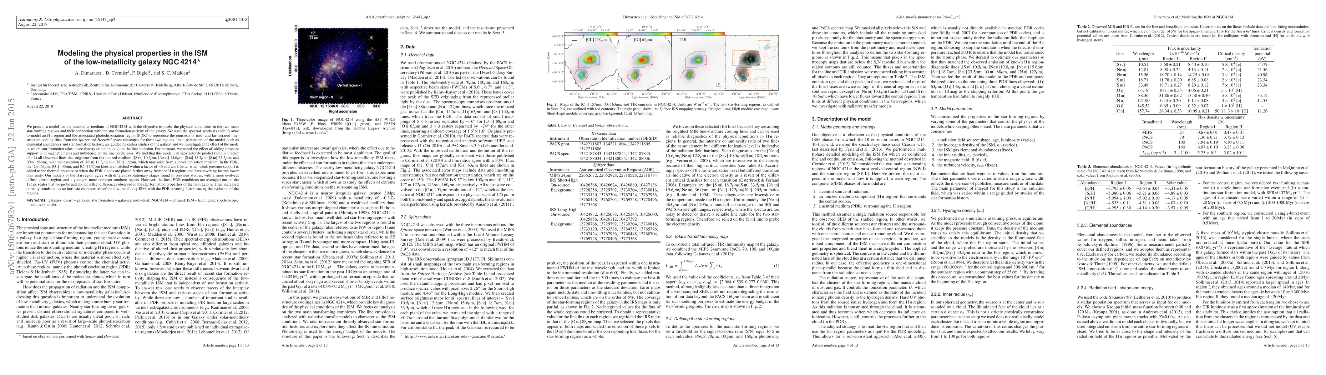 We present a model for the interstellar medium of NGC4214 with the objective to probe the physical conditions in the two main star-forming regions and their connection with the star formation activity of the galaxy. We used the spectral synthesis code Cloudy to model an HII region and the associated photodissociation region (PDR) to reproduce the emission of mid- and far-infrared fine-structure cooling lines from the Spitzer and Herschel space telescopes for these two regions. Input parameters of the model, such as elemental abundances and star formation history, are guided by earlier studies of the galaxy, and we investigated the effect of the mode in which star formation takes place (bursty or continuous) on the line emission. Furthermore, we tested the effect of adding pressure support with magnetic fields and turbulence on the line predictions. We find that this model can satisfactorily predict (within a factor of ~2) all observed lines that originate from the ionized medium ([SIV] 10.5um, [NeIII] 15.6um, [SIII] 18.7um, [SIII] 33.5um, and [OIII] 88um), with the exception of [NeII] 12.8um and [NII] 122um, which may arise from a lower ionization medium. In the PDR, the [OI] 63um, [OI] 145um, and [CII] 157um lines are matched within a factor of ~5 and work better when weak pressure support is added to the thermal pressure or when the PDR clouds are placed farther away from the HII regions and have covering factors lower than unity. Our models of the HII region agree with different evolutionary stages found in previous studies, with a more evolved, diffuse central region, and a younger, more compact southern region. However, the local PDR conditions are averaged out on the 175 pc scales that we probe and do not reflect differences observed in the star formation properties of the two regions.