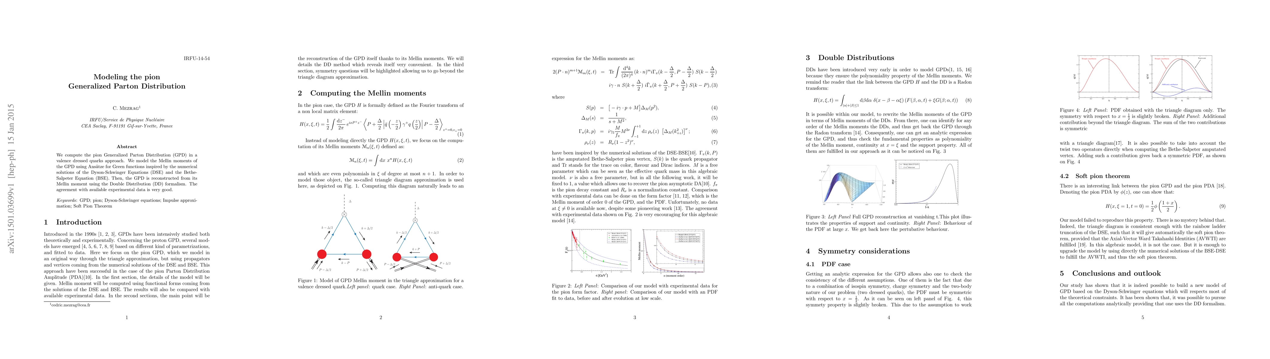 This paper models the pion Generalized Parton Distribution (GPD) using dressed valence quarks and reconstructs it from Mellin moments with Ansätze inspired by Dyson-Schwinger and Bethe-Salpeter equations, achieving good agreement with experimental data.