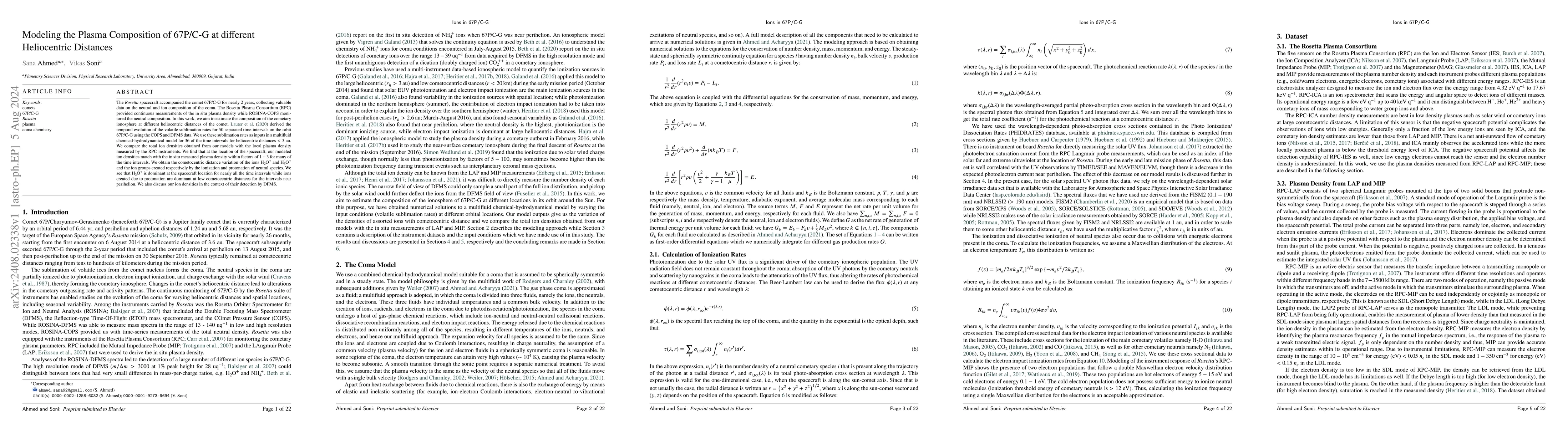 This study uses multifluid chemical-hydrodynamical modeling to estimate the plasma composition of comet 67P/C-G, comparing modeled ion densities with measurements from the Rosetta spacecraft. The model successfully matches observed plasma density within factors of 1-3, highlighting H3O+ dominance and variations in ion groups with heliocentric distance.