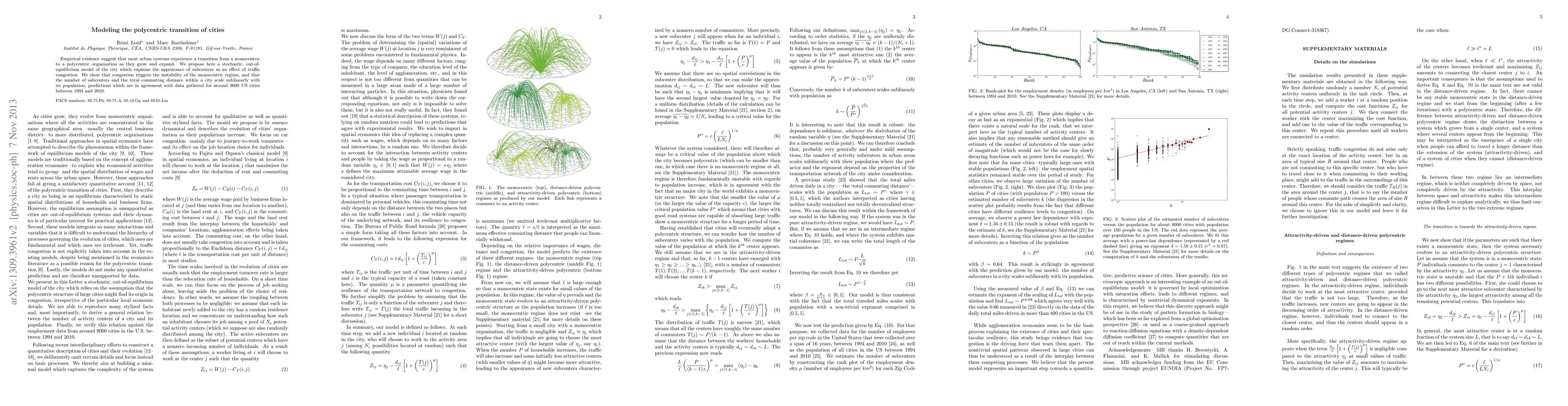 Empirical evidence suggest that most urban systems experience a transition from a monocentric to a polycentric organisation as they grow and expand. We propose here a stochastic, out-of-equilibrium model of the city which explains the appearance of subcenters as an effect of traffic congestion. We show that congestion triggers the unstability of the monocentric regime, and that the number of subcenters and the total commuting distance within a city scale sublinearly with its population, predictions which are in agreement with data gathered for around 9000 US cities between 1994 and 2010.