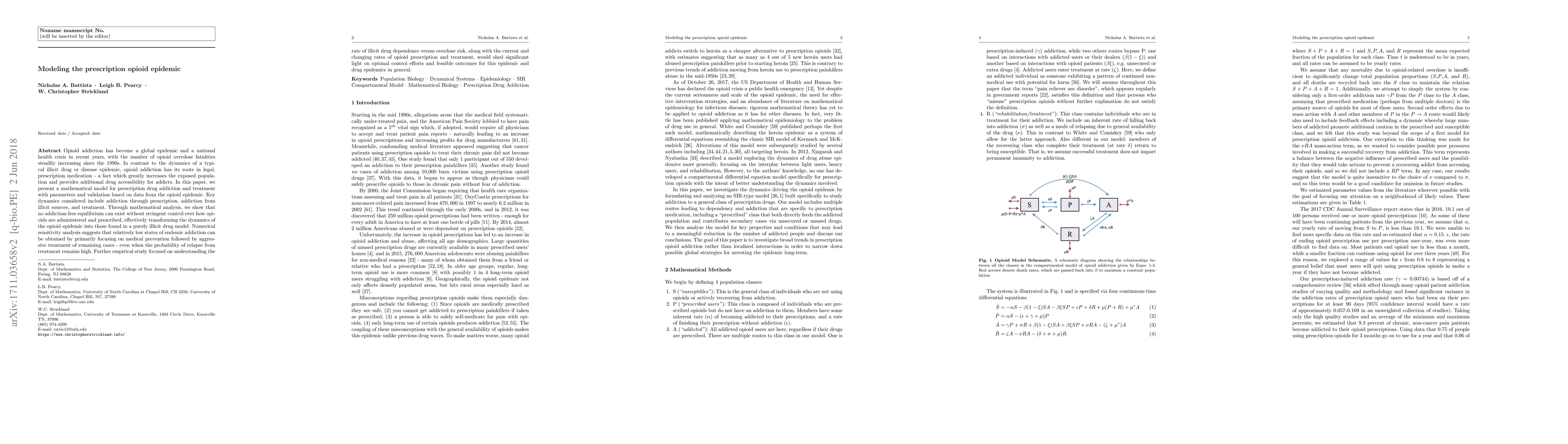 This paper develops a mathematical model to analyze the prescription opioid epidemic, emphasizing the dynamics of addiction through legal prescriptions and illicit sources. It concludes that stringent control over opioid prescriptions is essential to prevent addiction, and that medical prevention and aggressive treatment can reduce endemic addiction levels, even with high relapse rates.