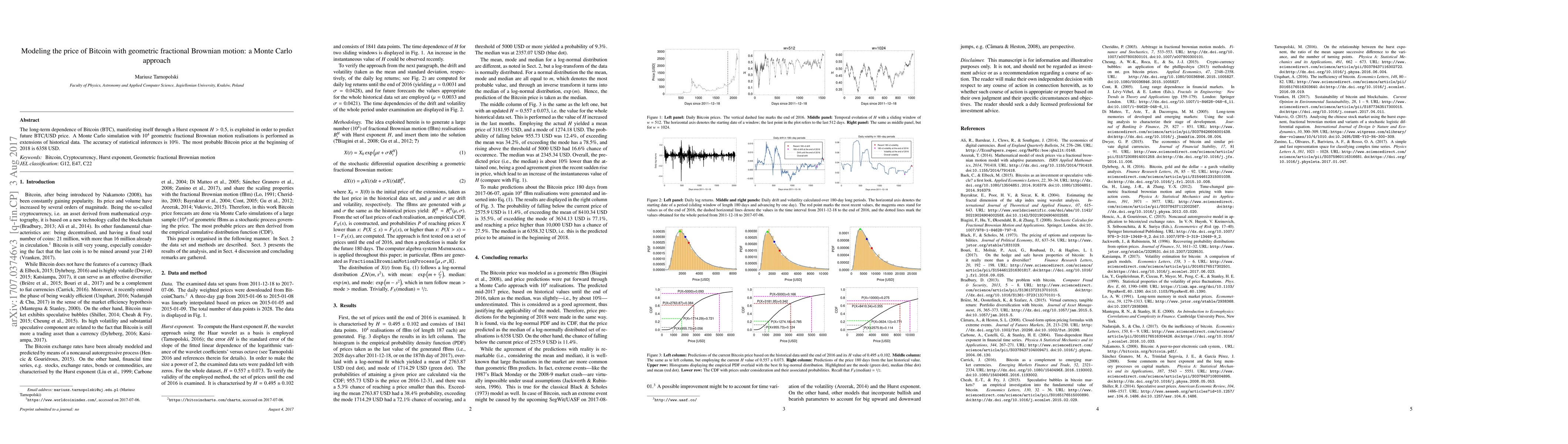 This paper models Bitcoin price using geometric fractional Brownian motion and a Monte Carlo approach to predict future prices, finding a Hurst exponent greater than 0.5 indicating long-term dependence. The model forecasts a most probable Bitcoin price of 6358 USD at the start of 2018 with 10% accuracy.
