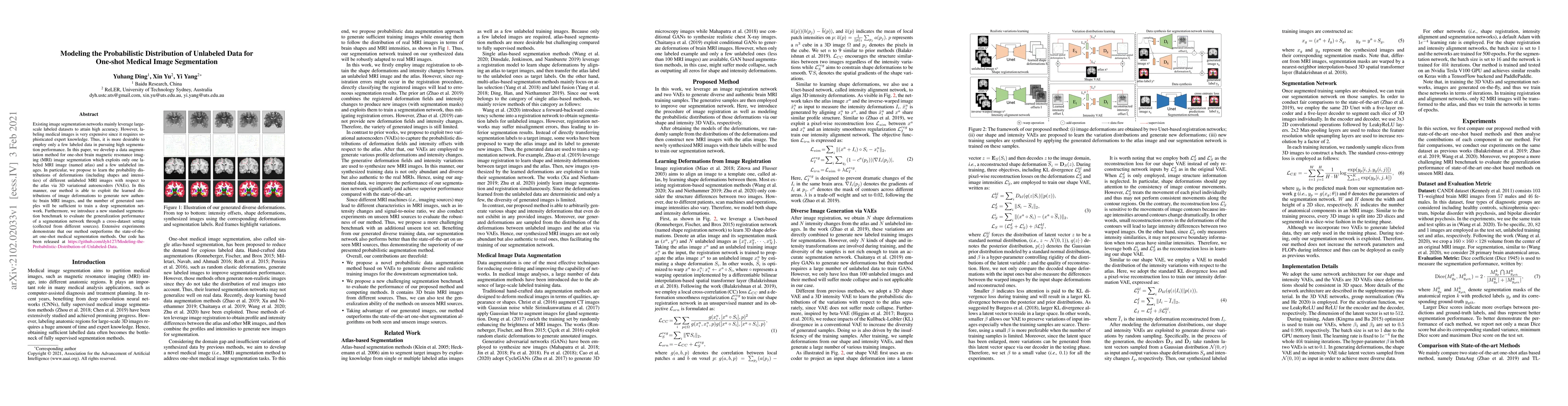 Existing image segmentation networks mainly leverage large-scale labeled datasets to attain high accuracy. However, labeling medical images is very expensive since it requires sophisticated expert knowledge. Thus, it is more desirable to employ only a few labeled data in pursuing high segmentation performance. In this paper, we develop a data augmentation method for one-shot brain magnetic resonance imaging (MRI) image segmentation which exploits only one labeled MRI image (named atlas) and a few unlabeled images. In particular, we propose to learn the probability distributions of deformations (including shapes and intensities) of different unlabeled MRI images with respect to the atlas via 3D variational autoencoders (VAEs). In this manner, our method is able to exploit the learned distributions of image deformations to generate new authentic brain MRI images, and the number of generated samples will be sufficient to train a deep segmentation network. Furthermore, we introduce a new standard segmentation benchmark to evaluate the generalization performance of a segmentation network through a cross-dataset setting (collected from different sources). Extensive experiments demonstrate that our method outperforms the state-of-the-art one-shot medical segmentation methods. Our code has been released at https://github.com/dyh127/Modeling-the-Probabilistic-Distribution-of-Unlabeled-Data.