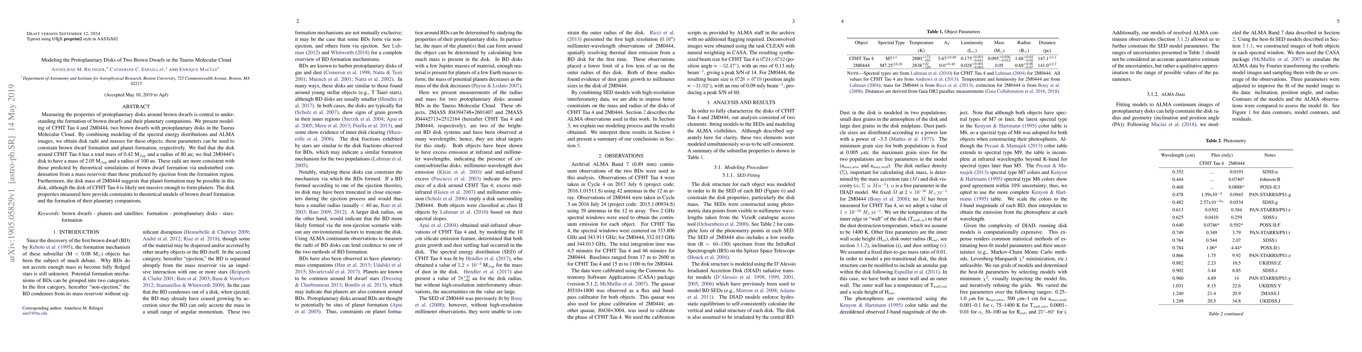 Measuring the properties of protoplanetary disks around brown dwarfs is central to understanding the formation of brown dwarfs and their planetary companions. We present modeling of CFHT Tau 4 and 2M0444, two brown dwarfs with protoplanetary disks in the Taurus Molecular Cloud. By combining modeling of the spectral energy distributions and ALMA images, we obtain disk radii and masses for these objects; these parameters can be used to constrain brown dwarf formation and planet formation, respectively. We find that the disk around CFHT Tau 4 has a mass of 0.42 M$_{Jup}$ and a radius of 80 au; we find 2M0444's disk to have a mass of 2.05 M$_{Jup}$ and a radius of 100 au. These radii are more consistent with those predicted by theoretical simulations of brown dwarf formation via undisturbed condensation from a mass reservoir than those predicted by ejection from the formation region. Furthermore, the disk mass of 2M0444 suggests that planet formation may be possible in this disk, although the disk of 2M0444 is likely not massive enough to form planets. The disk properties measured here provide constraints to theoretical models of brown dwarf formation and the formation of their planetary companions.