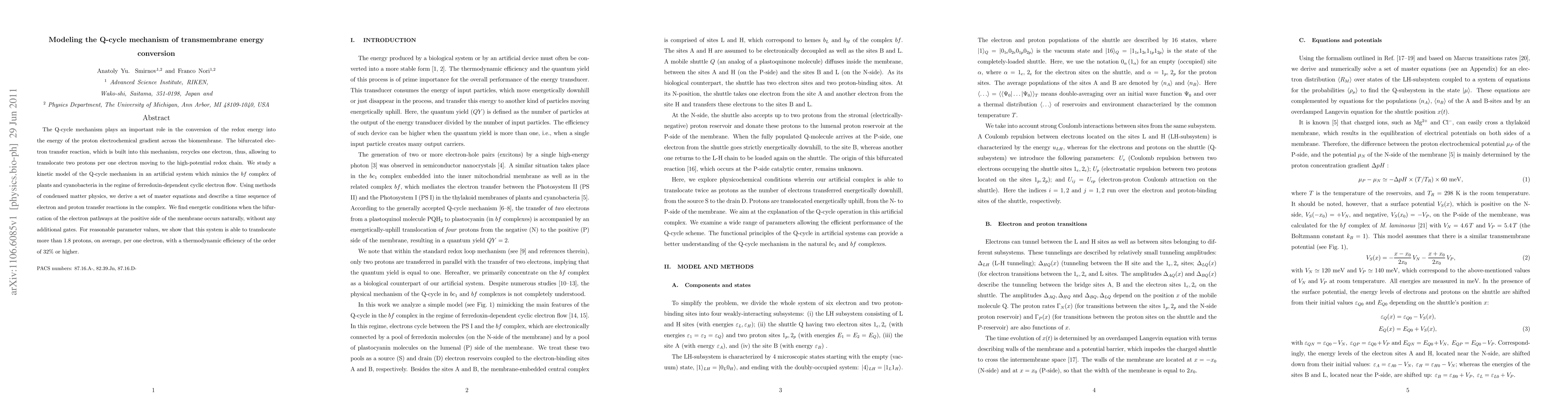 The Q-cycle mechanism plays an important role in the conversion of the redox energy into the energy of the proton electrochemical gradient across the biomembrane. The bifurcated electron transfer reaction, which is built into this mechanism, recycles one electron, thus, allowing to translocate two protons per one electron moving to the high-potential redox chain. We study a kinetic model of the Q-cycle mechanism in an artificial system which mimics the bf complex of plants and cyanobacteria in the regime of ferredoxin-dependent cyclic electron flow. Using methods of condensed matter physics, we derive a set of master equations and describe a time sequence of electron and proton transfer reactions in the complex. We find energetic conditions when the bifurcation of the electron pathways at the positive side of the membrane occurs naturally, without any additional gates. For reasonable parameter values, we show that this system is able to translocate more than 1.8 protons, on average, per one electron, with a thermodynamic efficiency of the order of 32% or higher.