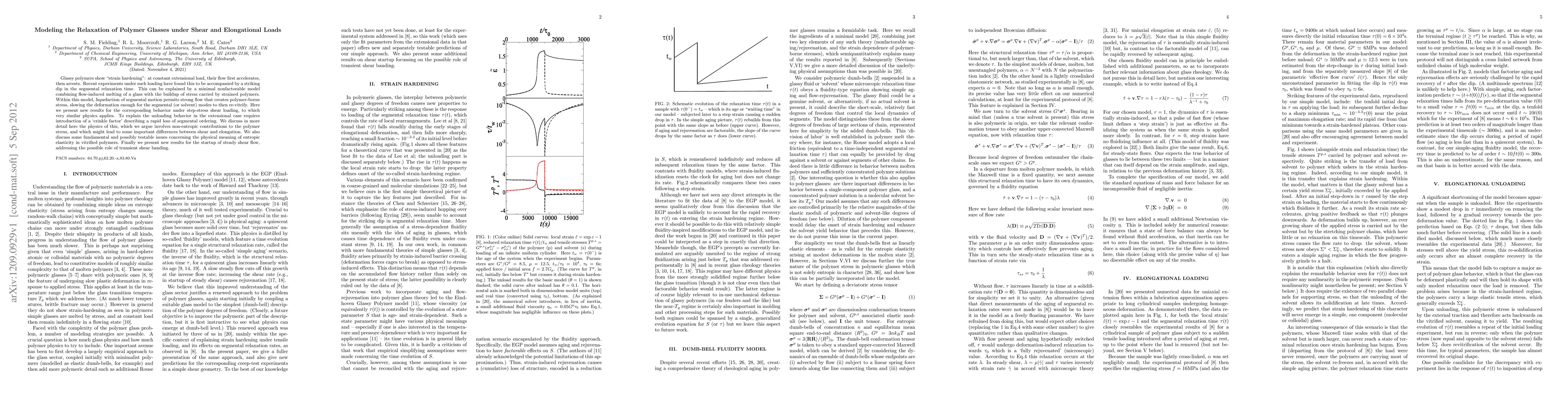 Glassy polymers show strain hardening: at constant extensional load, their flow first accelerates, then arrests. Recent experiments under such loading have found this to be accompanied by a striking dip in the segmental relaxation time. This can be explained by a minimal nonfactorable model combining flow-induced melting of a glass with the buildup of stress carried by strained polymers. Within this model, liquefaction of segmental motion permits strong flow that creates polymer-borne stress, slowing the deformation enough for the segmental (or solvent) modes to then re-vitrify. Here we present new results for the corresponding behavior under step-stress shear loading, to which very similar physics applies. To explain the unloading behavior in the extensional case requires introduction of a crinkle factor describing a rapid loss of segmental ordering. We discuss in more detail here the physics of this, which we argue involves non-entropic contributions to the polymer stress, and which might lead to some important differences between shear and elongation. We also discuss some fundamental and possibly testable issues concerning the physical meaning of entropic elasticity in vitrified polymers. Finally we present new results for the startup of steady shear flow, addressing the possible role of transient shear banding.