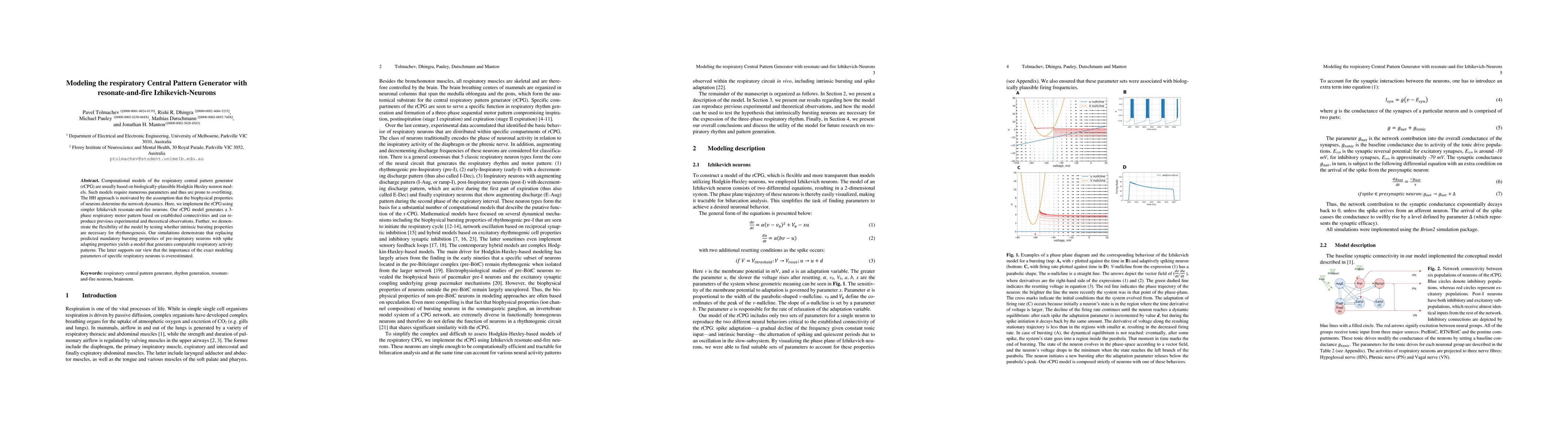 This paper models the respiratory central pattern generator (rCPG) using simpler Izhikevich neurons instead of the more complex Hodgkin-Huxley models, demonstrating that the network can still generate accurate respiratory patterns. The study shows that intrinsic bursting properties are not strictly necessary for rhythmogenesis, suggesting that precise modeling parameters may be overrated.
