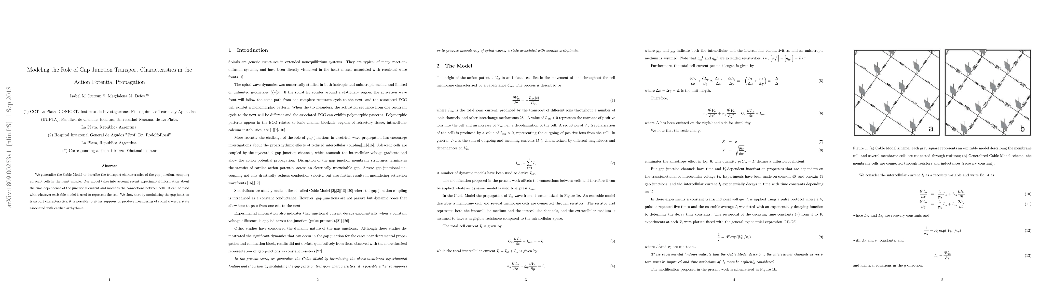 We generalize the Cable Model to describe the transport characteristics of the gap junctions coupling adjacent cells in the heart muscle. Our model takes into account recent experimental information about the time dependence of the junctional current and modifies the connections between cells. It can be used with whatever excitable model is used to represent the cell. We show that by modulating the gap junction transport characteristics, it is possible to either suppress or produce meandering of spiral waves, a state associated with cardiac arrhythmia.
