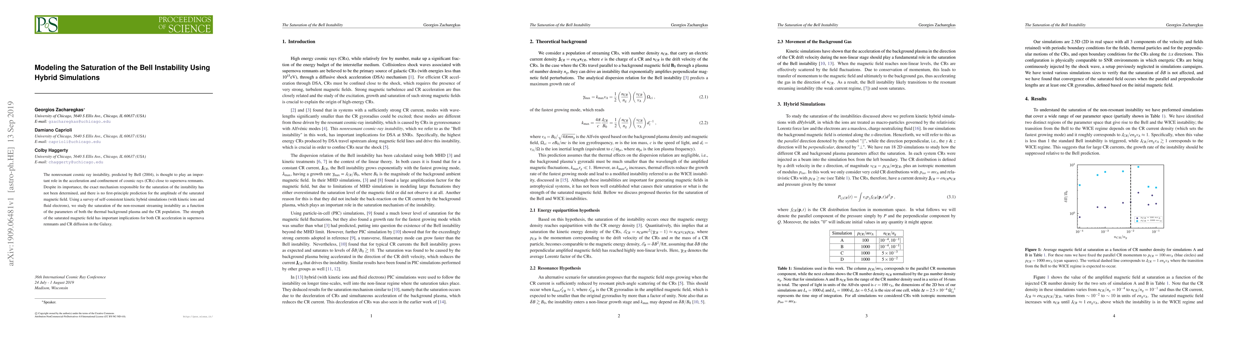 The research utilized self-consistent kinetic hybrid simulations (with kinetic ions and fluid electrons) to study the saturation of the non-resonant streaming instability as a function of thermal background plasma and cosmic ray (CR) population parameters.