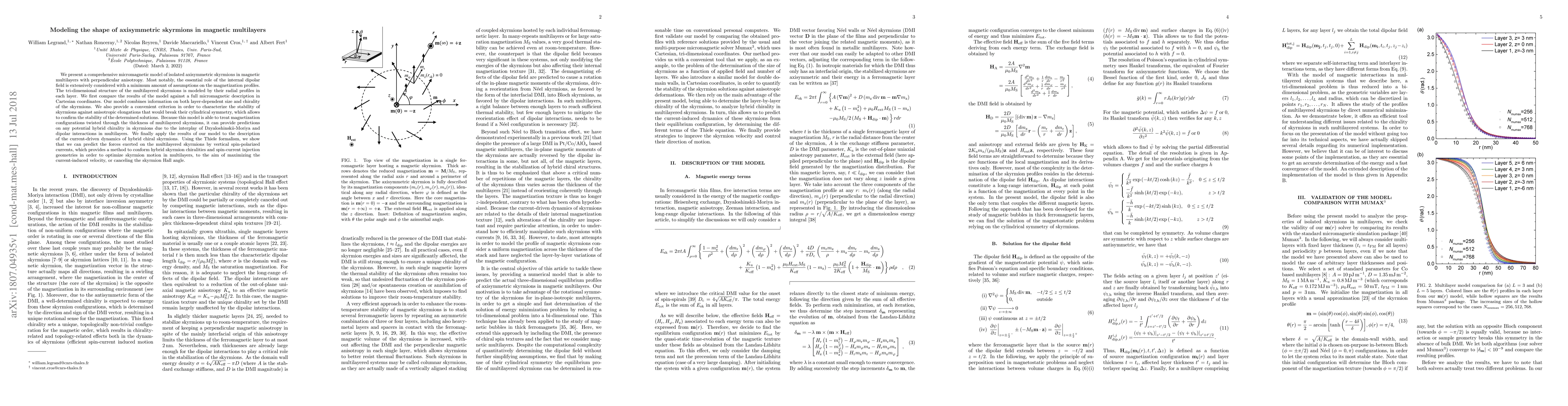 This research develops a micromagnetic model to study axisymmetric skyrmions in magnetic multilayers, focusing on the internal dipolar field and the multilayered structure's radial profiles. The model predicts hybrid chirality due to Dzyaloshinskii-Moriya and dipolar interactions, and uses the Thiele formalism to predict the forces on skyrmions from spin-polarized currents, optimizing their motion for enhanced current-induced velocity.