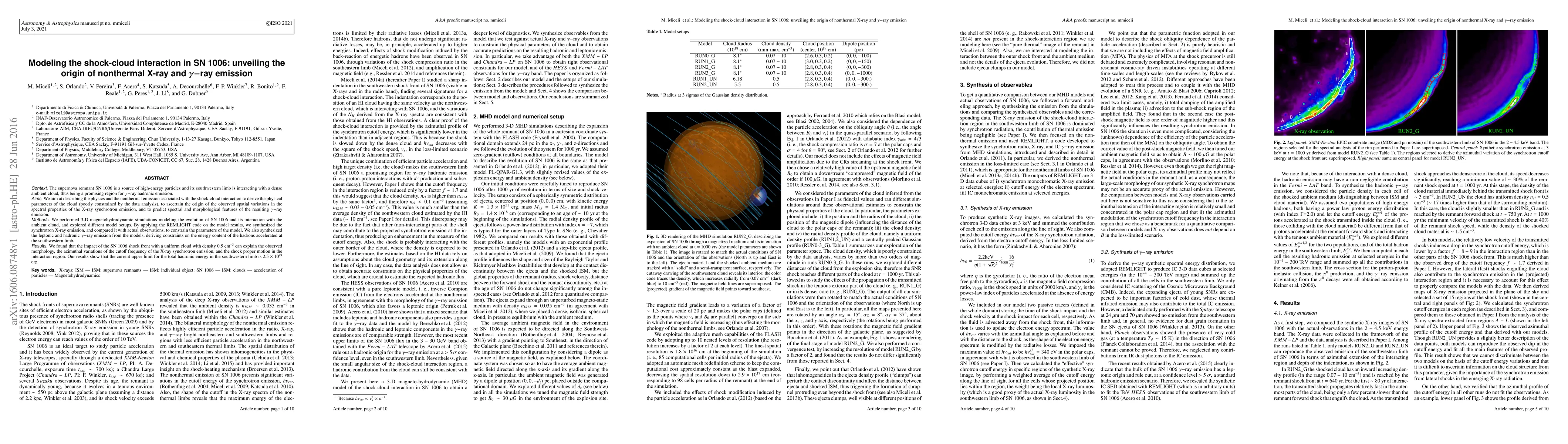 This paper investigates the shock-cloud interaction in SN 1006 using 3-D magnetohydrodynamic simulations to model the nonthermal X-ray and gamma-ray emissions. The study finds that a uniform cloud density of 0.5 cm^-3 can explain the observed X-ray synchrotron emission variations and predicts a total hadronic energy of 2.5e49 erg in the southwestern limb.