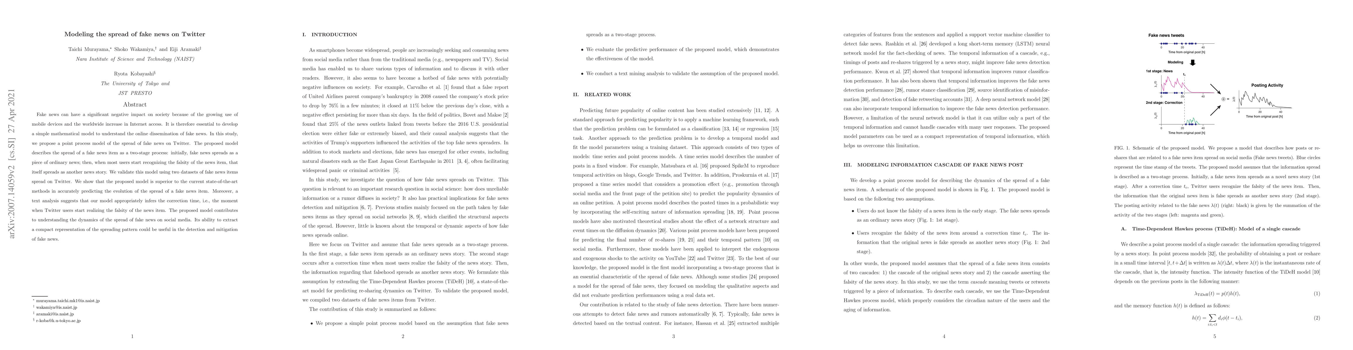 The study introduces a point process model to describe the two-stage spread of fake news on Twitter, initially as ordinary news and then as recognized falsehood. The proposed model outperforms existing methods in predicting the spread, contributing to better detection and mitigation of fake news.