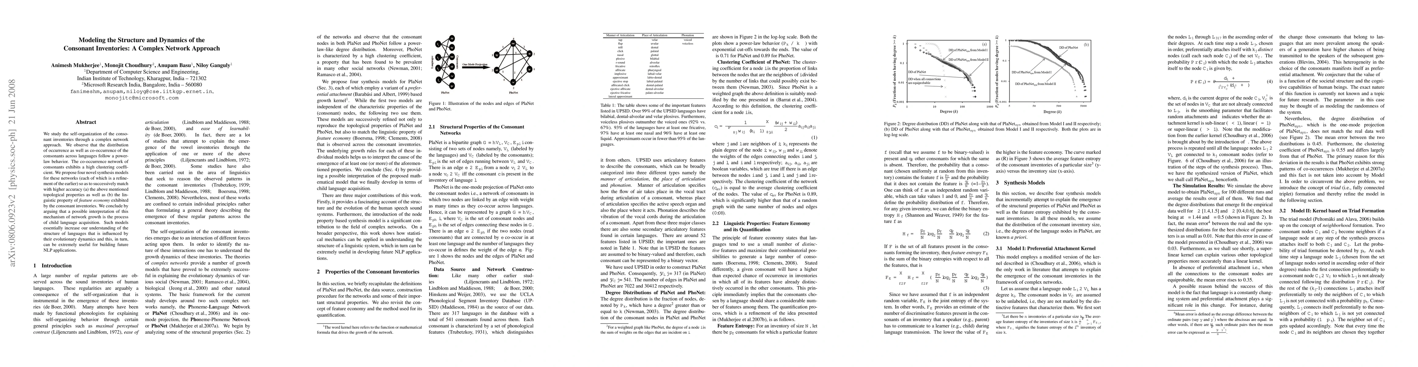 This paper employs a complex network approach to model the self-organization of consonant inventories, revealing power-law distributions and high clustering coefficients. The authors propose four synthesis models that progressively match the observed topological and linguistic features, suggesting that the network growth mechanism mirrors child language acquisition, thereby enhancing our understanding of language evolution and its implications for NLP.