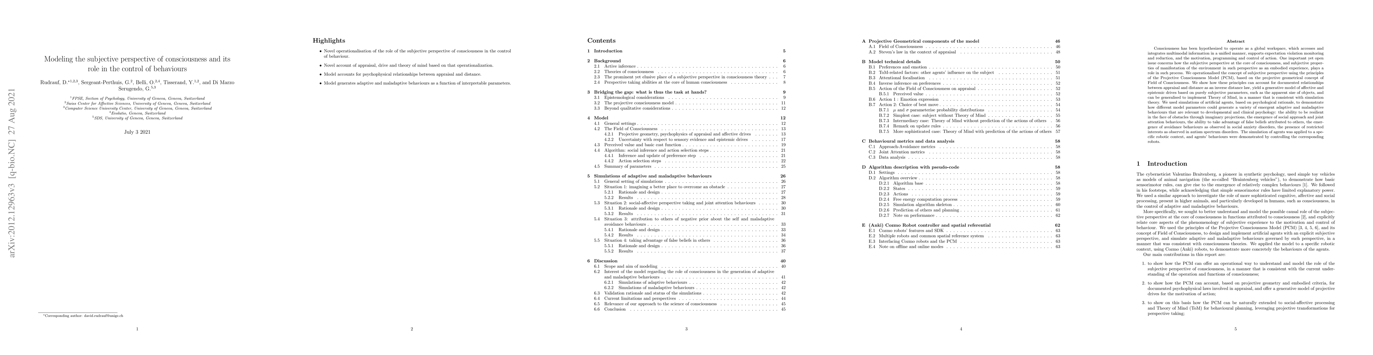 Consciousness has been hypothesized to operate as a global workspace, which accesses and integrates multimodal information in a unified manner, supports expectation violation monitoring and reduction, and the motivation, programming and control of action. One important yet open issue concerns how the subjective perspective at the core of consciousness, and subjective properties of manifestation of the environment in such perspective as an embodied experience, plays a role in such process. We operationalised the concept of subjective perspective using the principles of the Projective Consciousness Model (PCM), based on the projective geometrical concept of Field of Consciousness. We show how these principles can account for documented relationships between appraisal and distance as an inverse distance law, yield a generative model of affective and epistemic drives based on purely subjective parameters, such as the apparent size of objects, and can be generalised to implement Theory of Mind, in a manner that is consistent with simulation theory. We used simulations of artificial agents, based on psychological rationale, to demonstrate how different model parameters could generate a variety of emergent adaptive and maladaptive behaviours that are relevant to developmental and clinical psychology: the ability to be resilient in the face of obstacles through imaginary projections, the emergence of social approach and joint attention behaviours, the ability to take advantage of false beliefs attributed to others, the emergence of avoidance behaviours as observed in social anxiety disorders, the presence of restricted interests as observed in autism spectrum disorders. The simulation of agents was applied to a specific robotic context, and agents' behaviours were demonstrated by controlling the corresponding robots.