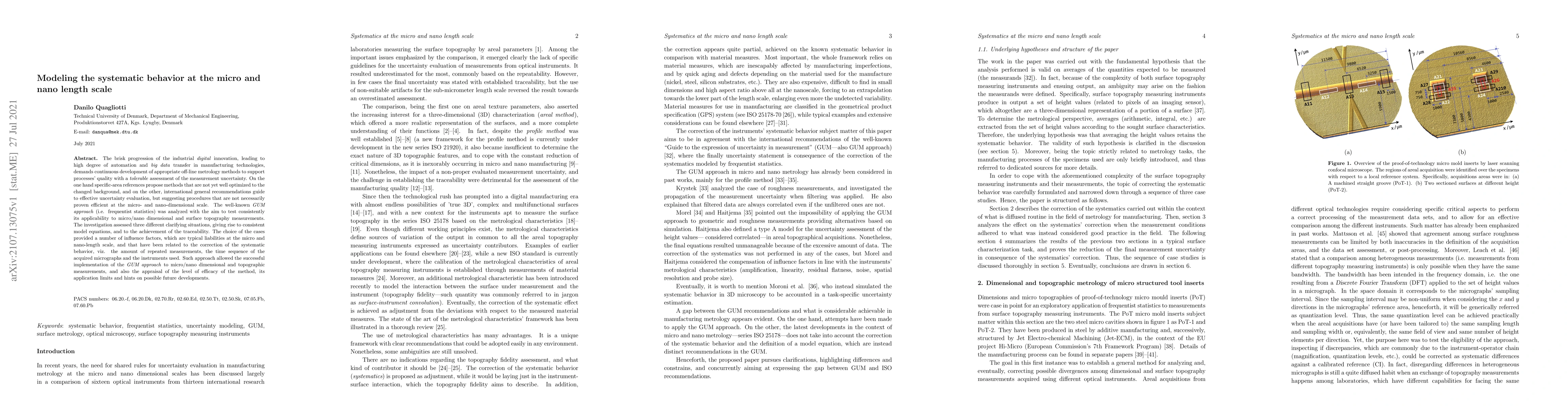The brisk progression of the industrial digital innovation, leading to high degree of automation and big data transfer in manufacturing technologies, demands continuous development of appropriate off-line metrology methods to support processes' quality with a tolerable assessment of the measurement uncertainty. On the one hand specific-area references propose methods that are not yet well optimized to the changed background, and on the other, international general recommendations guide to effective uncertainty evaluation, but suggesting procedures that are not necessarily proven efficient at the micro- and nano-dimensional scale. The well-known GUM approach (i.e. frequentist statistics) was analyzed with the aim to test consistently its applicability to micro/nano dimensional and surface topography measurements. The investigation assessed three different clarifying situations, giving rise to consistent model equations, and to the achievement of the traceability. The choice of the cases provided a number of influence factors, which are typical liabilities at the micro and nano-length scale, and that have been related to the correction of the systematic behavior, viz. the amount of repeated measurements, the time sequence of the acquired micrographs and the instruments used. Such approach allowed the successful implementation of the GUM approach to micro/nano dimensional and topographic measurements, and also the appraisal of the level of efficacy of the method, its application limits and hints on possible future developments.