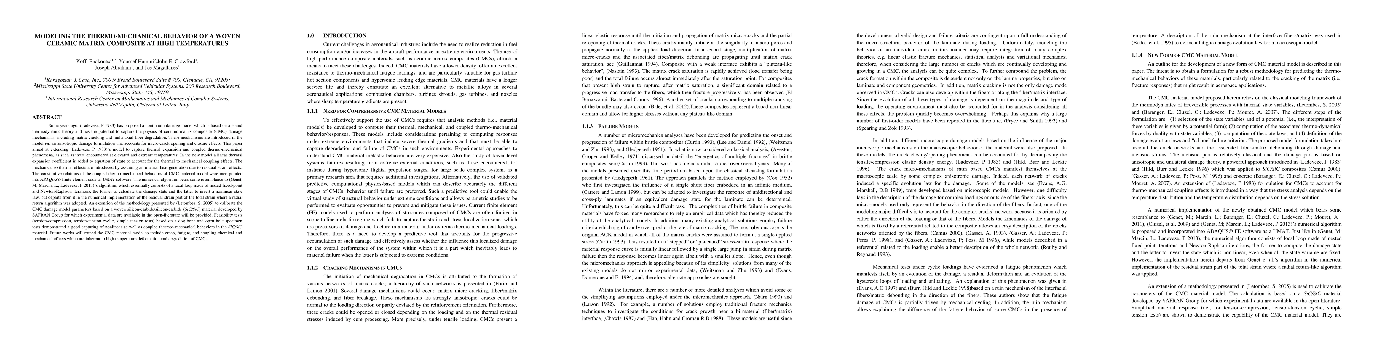 This paper aimed at extending a model developed by Ladeveze to capture thermal expansion and coupled thermo-mechanical phenomena, as such as those encountered at elevated and extreme temperatures. In the new model a linear thermal expansion coefficient is added to equation of state to account for the thermal to mechanical coupling effects. The mechanical to thermal effects are introduced by assuming an internal heat generation due to residual strain effects. The constitutive relations of the coupled thermo-mechanical behaviors of ceramic matrix composite material model were incorporated into Abaqus finite element code as user defined material software. An extension of the methodology presented by Letombes to calibrate the ceramic matrix composite damage model parameters based on a woven silicon-carbide silicon-carbide material developed by Safran Group. Feasibility tests (tension-compression, tension-tension cyclic, simple tension tests) based on a dog bone and open hole specimen tests demonstrated a good capturing of nonlinear as well as coupled thermos-mechanical behaviors in the silicon-carbide silicon-carbide material.