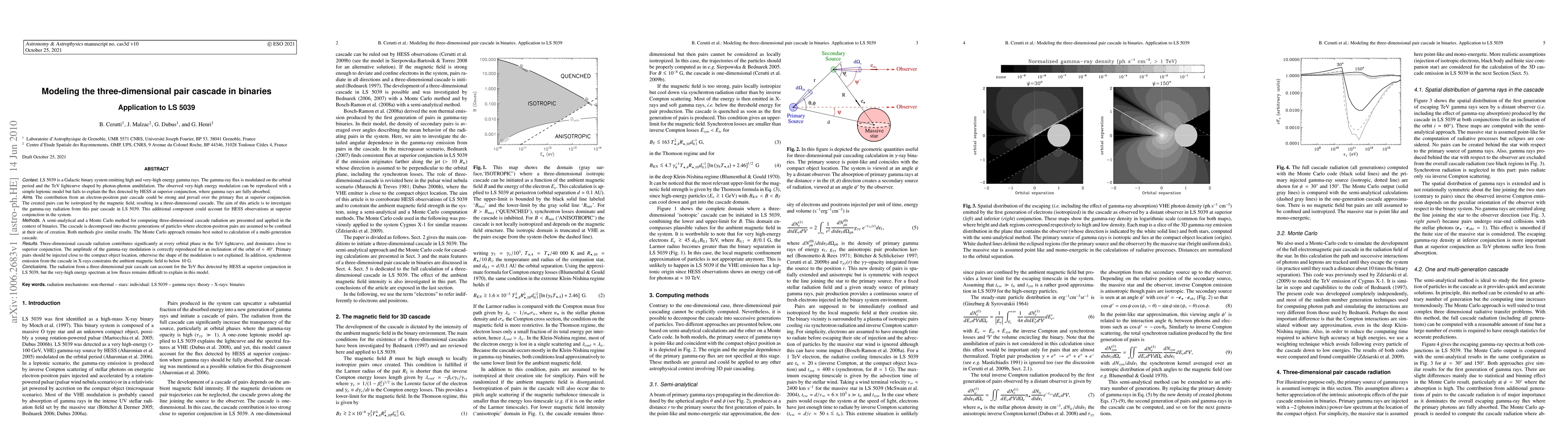 LS 5039 is a Galactic binary system emitting high and very-high energy gamma rays. The gamma-ray flux is modulated on the orbital period and the TeV lightcurve shaped by photon-photon annihilation. The observed very-high energy modulation can be reproduced with a simple leptonic model but fails to explain the flux detected by HESS at superior conjunction, where gamma rays are fully absorbed. The contribution from an electron-positron pair cascade could be strong and prevail over the primary flux at superior conjunction. The created pairs can be isotropized by the magnetic field, resulting in a three-dimensional cascade. The aim of this article is to investigate the gamma ray radiation from this pair cascade in LS 5039. This additional component could account for HESS observations at superior conjunction in the system. A semi-analytical and a Monte Carlo method for computing three-dimensional cascade radiation are presented and applied in the context of binaries. Three-dimensional cascade radiation contributes significantly at every orbital phase in the TeV lightcurve, and dominates close to superior conjunction. The amplitude of the gamma-ray modulation is correctly reproduced for an inclination of the orbit of about 40 degrees. Primary pairs should be injected close to the compact object location, otherwise the shape of the modulation is not explained. In addition, synchrotron emission from the cascade in X-rays constrains the ambient magnetic field to below 10 G. The radiation from a three-dimensional pair cascade can account for the TeV flux detected by HESS at superior conjunction in LS 5039, but the very-high energy spectrum at low fluxes remains difficult to explain in this model.