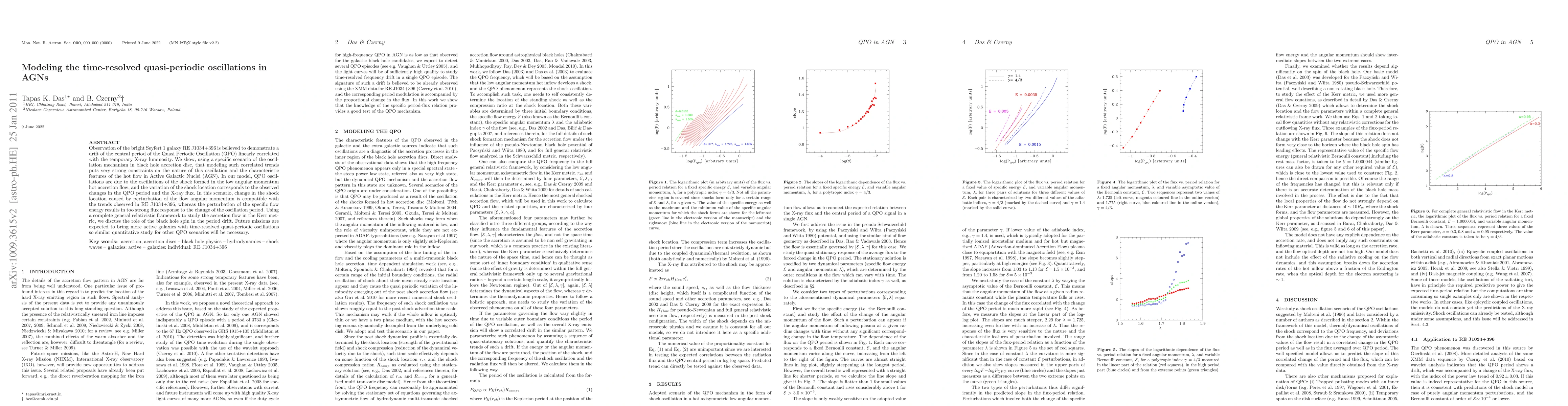 Observation of the bright Seyfert 1 galaxy RE J1034+396 is believed to demonstrate a drift of the central period of the Quasi Periodic Oscillation (QPO) linearly correlated with the temporary X-ray luminosity. We show, using a specific scenario of the oscillation mechanism in black hole accretion disc, that modeling such correlated trends puts very strong constraints on the nature of this oscillation and the characteristic features of the hot flow in Active Galactic Nuclei (AGN). In our model, QPO oscillations are due to the oscillations of the shock formed in the low angular momentum hot accretion flow, and the variation of the shock location corresponds to the observed changes in the QPO period and the X-ray flux. In this scenario, change in the shock location caused by perturbation of the flow angular momentum is compatible with the trends observed in RE J1034+396, whereas the perturbation of the specific flow energy results in too strong flux response to the change of the oscillation period. Using a complete general relativistic framework to study the accretion flow in the Kerr metric, we discuss the role of the black hole spin in the period drift. Future missions are expected to bring more active galaxies with time-resolved quasi-periodic oscillations so similar quantitative study for other QPO scenarios will be necessary.