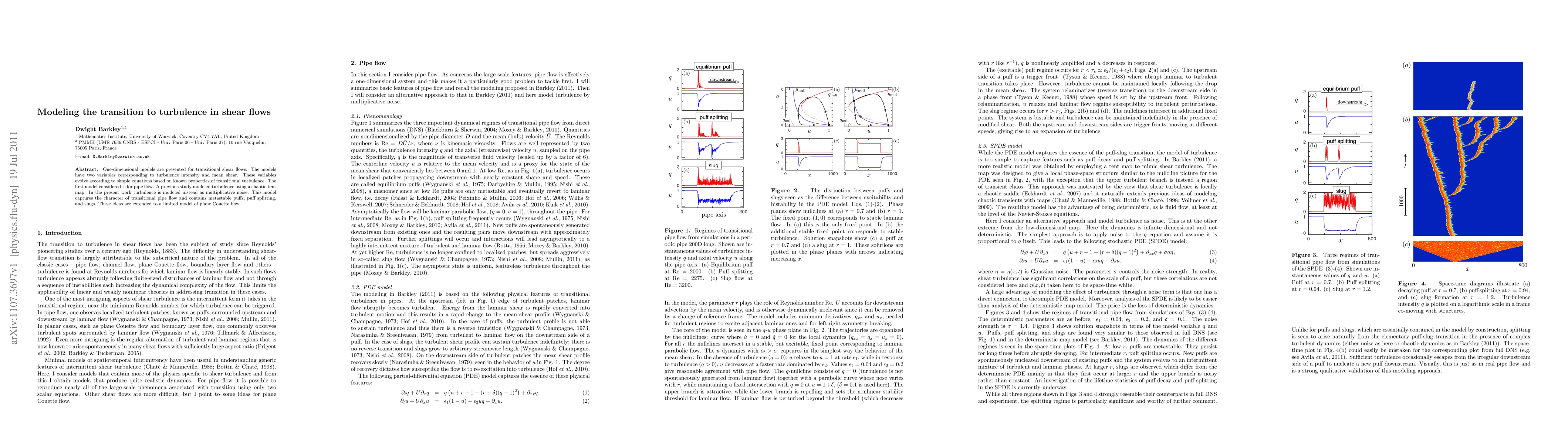 The research presents one-dimensional models for transitional shear flows using two variables: turbulence intensity and mean shear. These variables evolve according to simple equations based on known properties of transitional turbulence, initially applied to pipe flow, then extended to plane Couette flow.