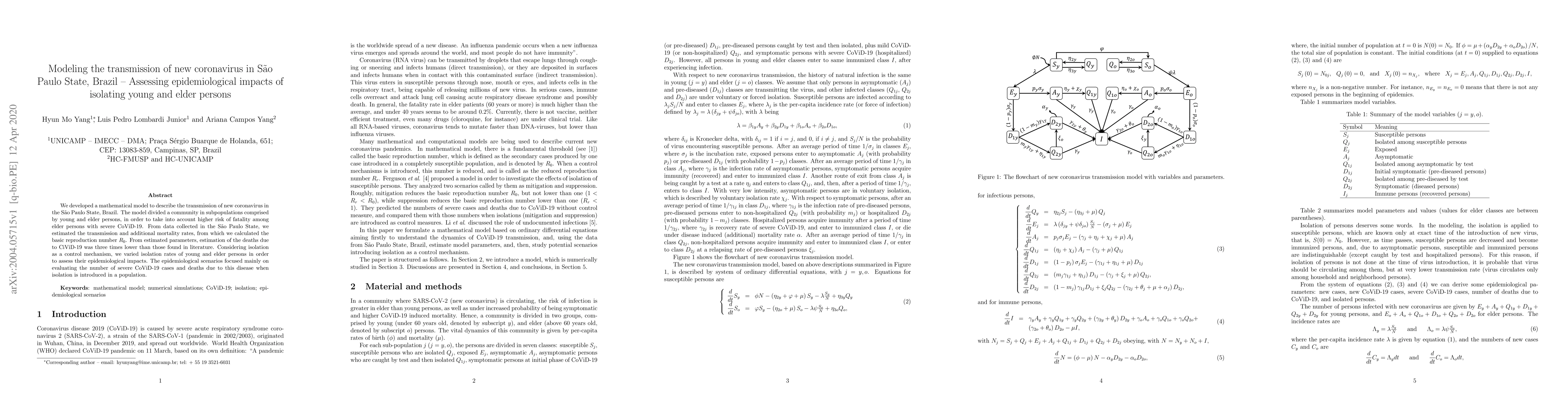 We developed a mathematical model to describe the transmission of new coronavirus in the S\~ao Paulo State, Brazil. The model divided a community in subpopulations comprised by young and elder persons, in order to take into account higher risk of fatality among elder persons with severe CoViD-19. From data collected in the S\~ao Paulo State, we estimated the transmission and additional mortality rates, from which we calculated the basic reproduction number R0. From estimated parameters, estimation of the deaths due to CoViD-19 was three times lower than those found in literature. Considering isolation as a control mechanism, we varied isolation rates of young and elder persons in order to assess their epidemiological impacts. The epidemiological scenarios focused mainly on evaluating the number of severe CoViD-19 cases and deaths due to this disease when isolation is introduced in a population.