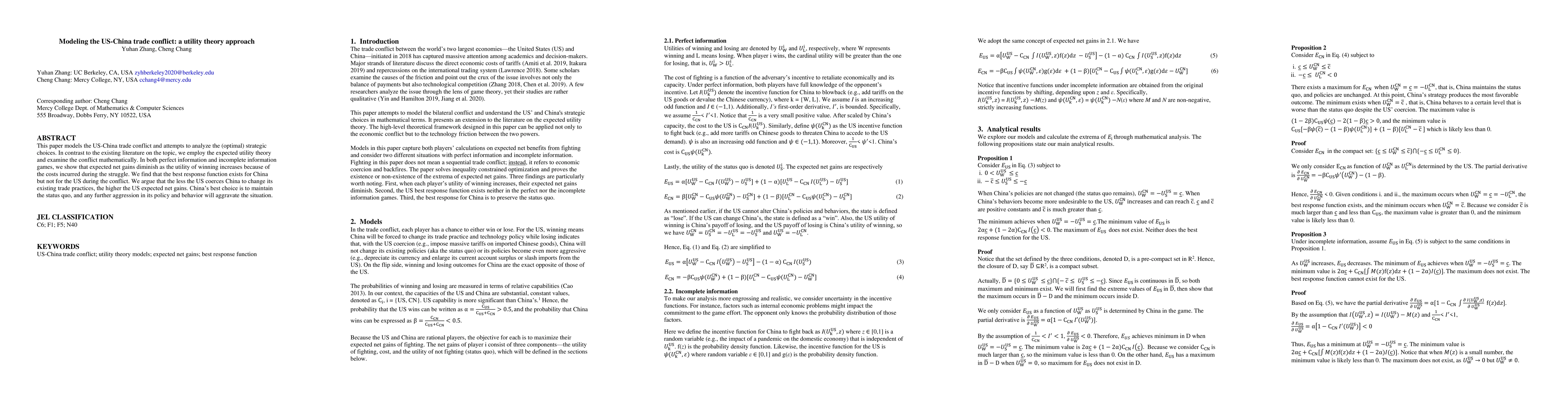 This research applies expected utility theory to model the US-China trade conflict, revealing that diminishing net gains result from increased struggle costs. The best response function favors China maintaining the status quo, while the US gains more by avoiding coercion. The study suggests that further aggression from China could worsen the situation.