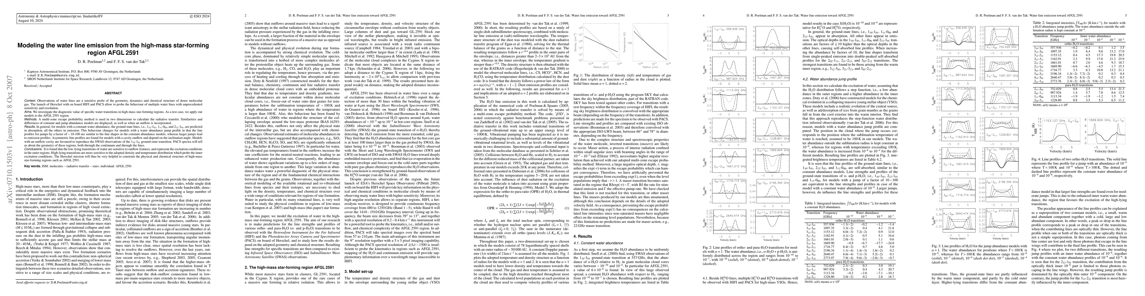 Context: observations of water lines are a sensitive probe of the geometry, dynamics and chemical structure of dense molecular gas. The launch of Herschel with on board HIFI and PACS allow to probe the behaviour of multiple water lines with unprecedented sensitivity and resolution. Aims: we investigate the diagnostic value of specific water transitions in high-mass star-forming regions. As a test case, we apply our models to the AFGL2591 region. Results: in general, for models with a constant water abundance, the ground state lines, i.e., 1_(10)-1_(01), 1_(11)-0_(00), and 2_(12)-1_(01), are predicted in absorption, all the others in emission. This behaviour changes for models with a water abundance jump profile in that the line profiles for jumps by a factor of ~10-100 are similar to the line shapes in the constant abundance models, whereas larger jumps lead to emission profiles. Asymmetric line profiles are found for models with a cavity outflow and depend on the inclination angle. Models with an outflow cavity are favoured to reproduce the SWAS observations of the 1_(10)-1_(01) ground-state transition. PACS spectra will tell us about the geometry of these regions, both through the continuum and through the lines. Conclusions: it is found that the low-lying transitions of water are sensitive to outflow features, and represent the excitation conditions in the outer regions. High-lying transitions are more sensitive to the adopted density and temperature distribution which probe the inner excitation conditions. The Herschel mission will thus be very helpful to constrain the physical and chemical structure of high-mass star-forming regions such as AFGL2591.