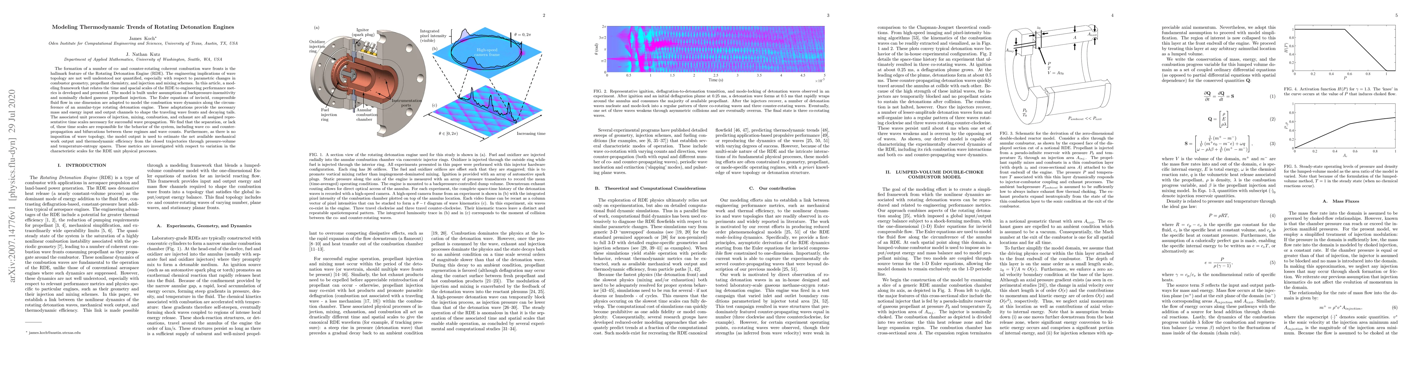 This paper develops a modeling framework to analyze the thermodynamic trends of Rotating Detonation Engines (RDEs), focusing on the combustion wave dynamics and their dependence on geometric, chemical, and injection parameters. The model estimates net mechanical work output and thermodynamic efficiency based on the separation of time scales for key unit processes.