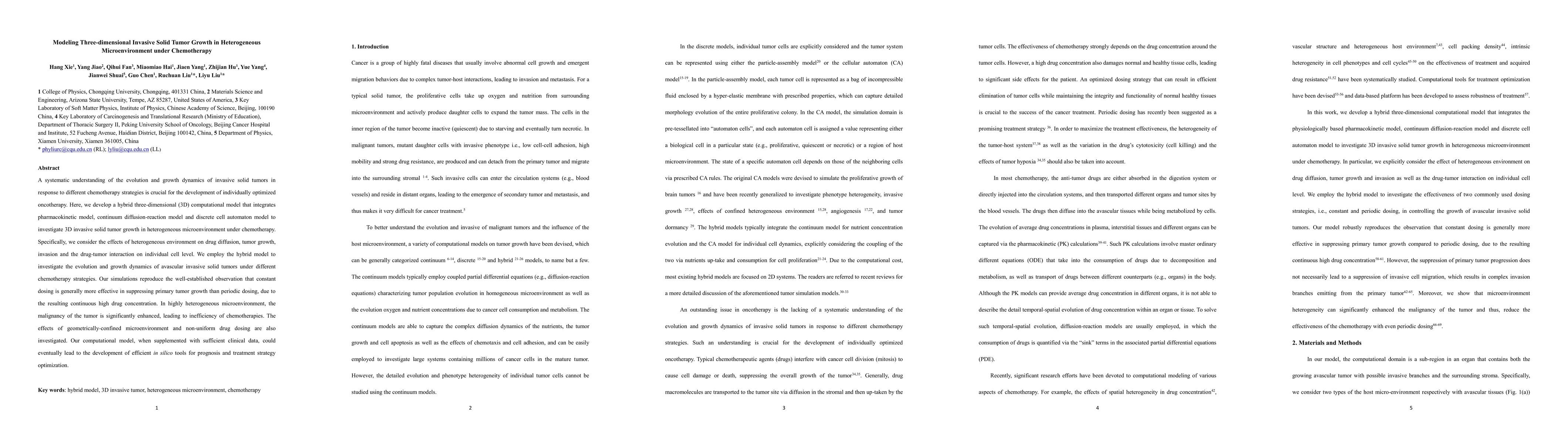This paper develops a hybrid 3D computational model to study the growth dynamics of invasive solid tumors in a heterogeneous microenvironment under chemotherapy, showing that constant dosing is more effective than periodic dosing. It highlights the impact of the tumor's microenvironment on drug efficacy and suggests potential for personalized treatment optimization.