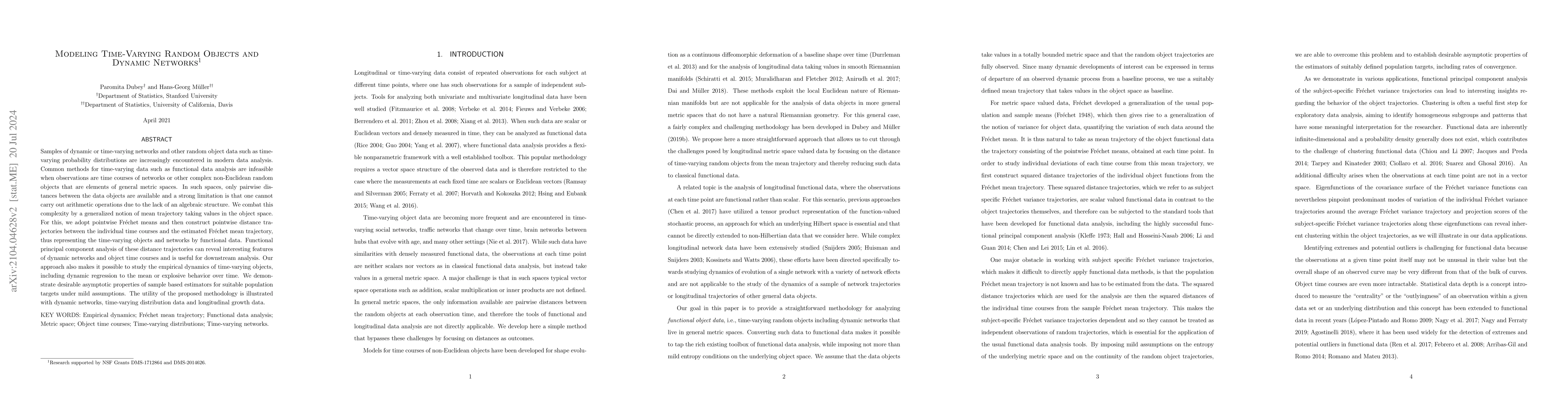 This paper proposes a novel method for modeling time-varying random objects and dynamic networks by using pointwise Fréchet means to construct mean trajectories and distance trajectories, enabling functional principal component analysis for revealing features of dynamic networks. The method is demonstrated to have desirable asymptotic properties and is applied to dynamic networks, time-varying distribution data, and longitudinal growth data.