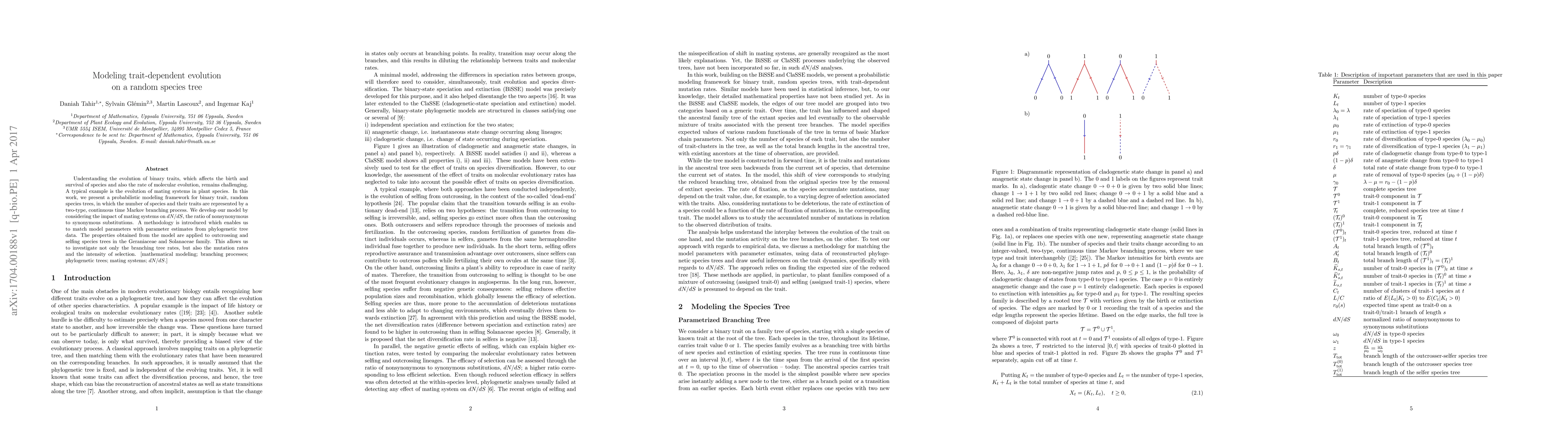This study develops a probabilistic model for binary trait evolution on random species trees, allowing researchers to investigate how traits like mating systems impact species survival and molecular evolution. The model's findings provide insights into the branching rates, mutation rates, and intensity of selection in plant families.