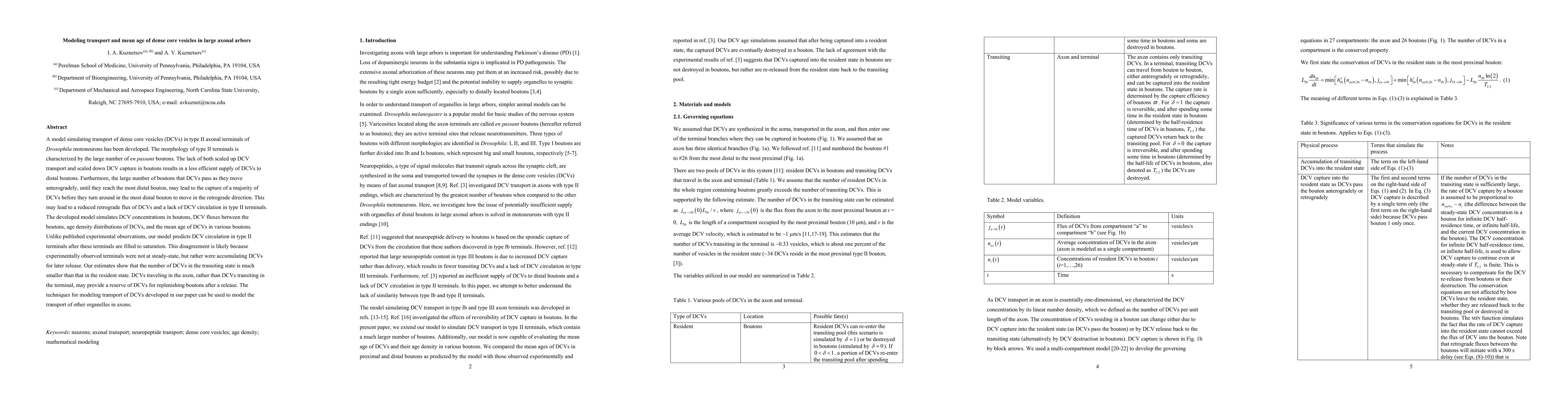 A computer model simulates transport of dense core vesicles in Drosophila neurons, finding that DCVs circulate even when terminals are full, with most DCVs residing in the axon rather than terminal.