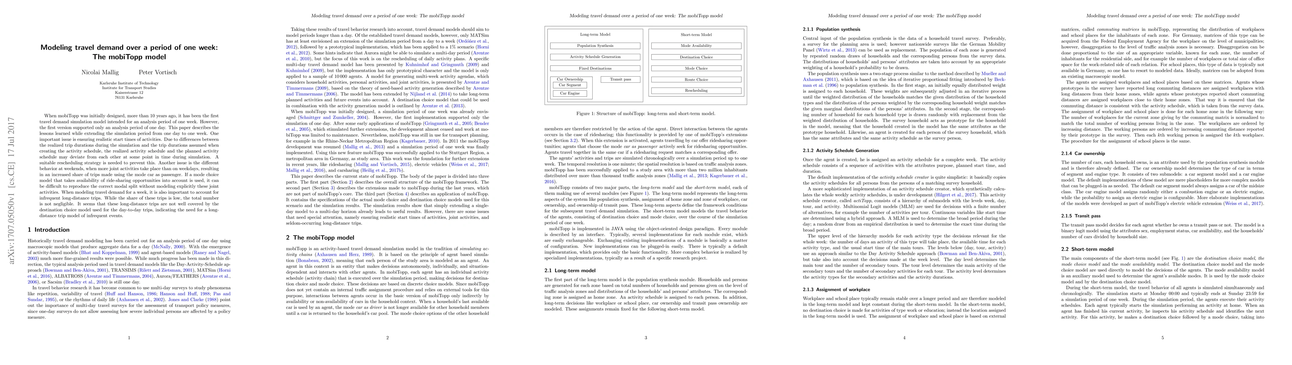 When mobiTopp was initially designed, more than 10 years ago, it has been the first travel demand simulation model intended for an analysis period of one week. However, the first version supported only an analysis period of one day. This paper describes the lessons learned while extending the simulation period from one day to one week. One important issue is ensuring realistic start times of activities. Due to differences between the realized trip durations during the simulation and the trip durations assumed when creating the activity schedule, the realized activity schedule and the planned activity schedule may deviate from each other at some point in time during simulation. A suitable rescheduling strategy is needed to prevent this. Another issue is the different behavior at weekends, when more joint activities take place than on weekdays, resulting in an increased share of trips made using the mode car as passenger. If a mode choice model that takes availability of ride-sharing opportunities into account is used, it can be difficult to reproduce the correct modal split without modeling explicitly these joint activities. When modeling travel demand for a week, it is also important to account for infrequent long-distance trips. While the share of these trips is low, the total number is not negligible. It seems that these long-distance trips are not well covered by the destination choice model used for the day-to-day trips, indicating the need for a long-distance trip model of infrequent events.