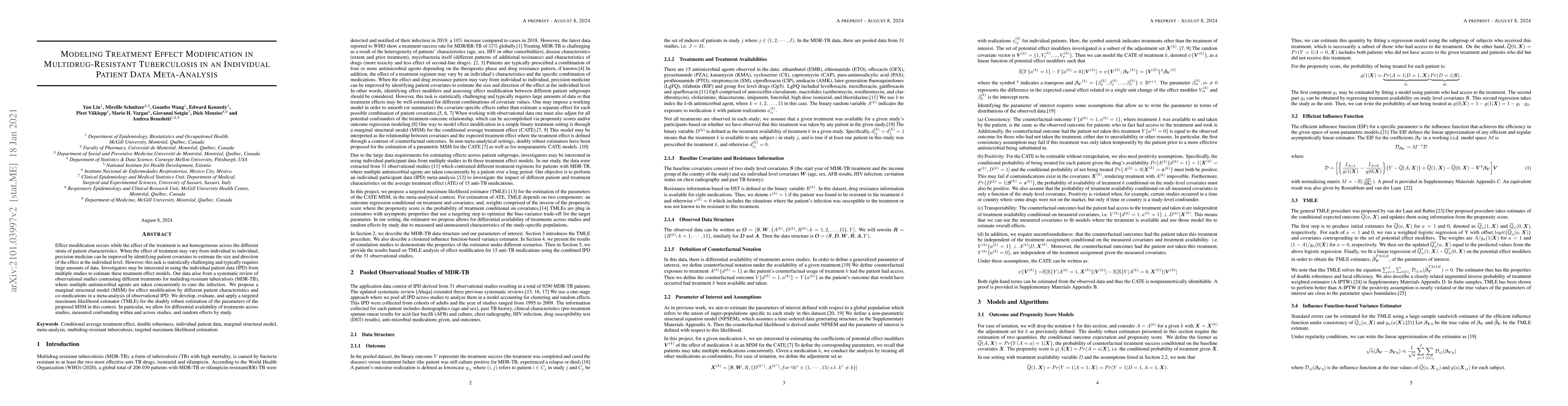 This paper proposes a marginal structural model (MSM) and a targeted maximum likelihood estimator (TMLE) to analyze treatment effect modification in multidrug-resistant tuberculosis (MDR-TB) using individual patient data (IPD) from multiple observational studies. The approach accounts for confounding and differential treatment availability across studies.