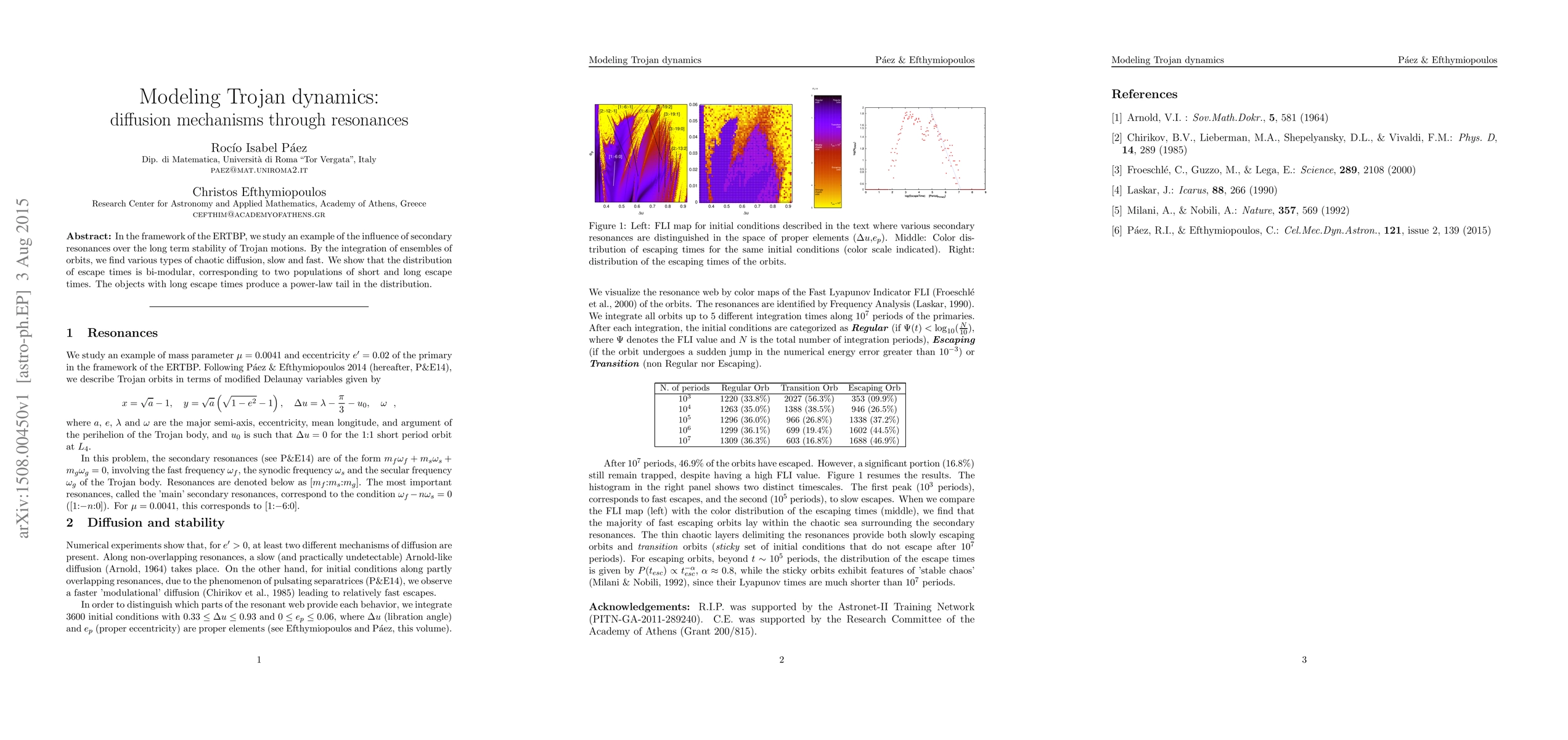 In the framework of the ERTBP, we study an example of the influence of secondary resonances over the long term stability of Trojan motions. By the integration of ensembles of orbits, we find various types of chaotic diffusion, slow and fast. We show that the distribution of escape times is bi-modular, corresponding to two populations of short and long escape times. The objects with long escape times produce a power-law tail in the distribution.