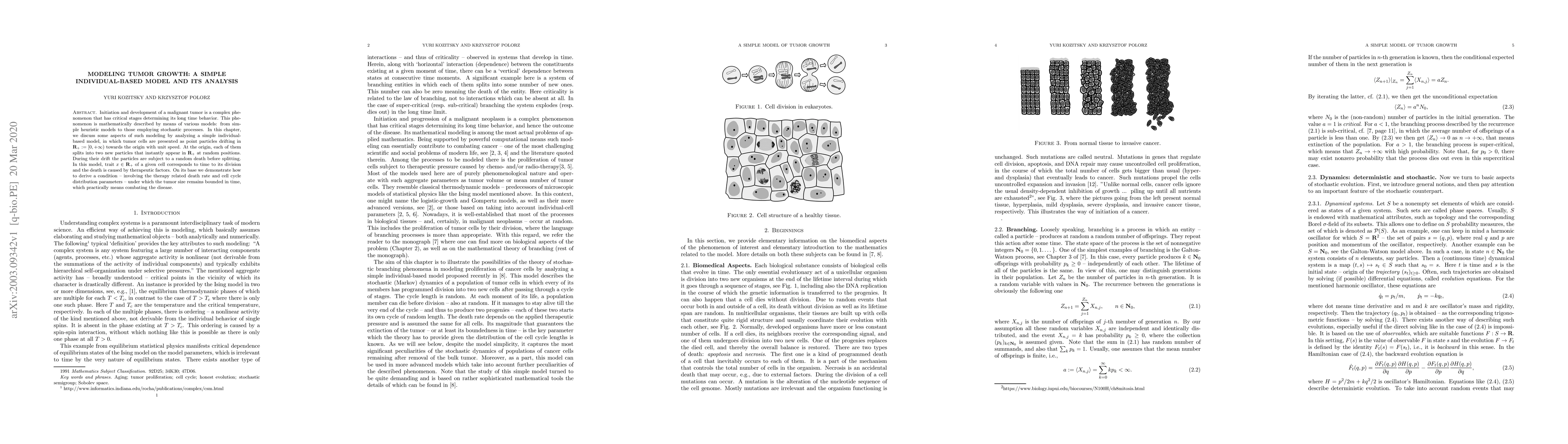 Initiation and development of a malignant tumor is a complex phenomenon that has critical stages determining its long time behavior. This phenomenon is mathematically described by means of various models: from simple heuristic models to those employing stochastic processes. In this chapter, we discuss some aspects of such modeling by analyzing a simple individual-based model, in which tumor cells are presented as point particles drifting in $\mathbf{R}_{+}:=[0,+\infty)$ towards the origin with unit speed. At the origin, each of them splits into two new particles that instantly appear in $\mathbf{R}_{+}$ at random positions. During their drift the particles are subject to a random death before splitting. In this model, trait $x\in \mathbf{R}_{+}$ of a given cell corresponds to time to its division and the death is caused by therapeutic factors. On its base we demonstrate how to derive a condition -- involving the therapy related death rate and cell cycle distribution parameters -- under which the tumor size remains bounded in time, which practically means combating the disease.