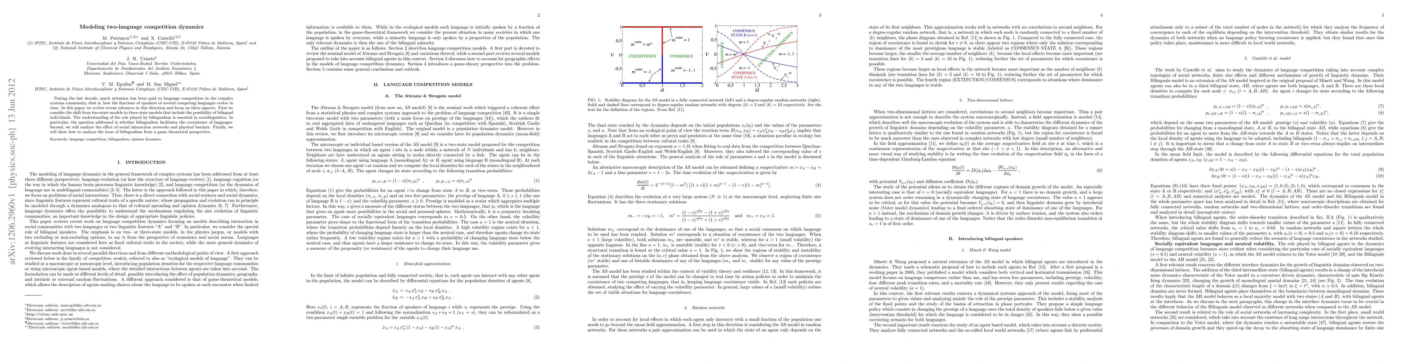 During the last decade, much attention has been paid to language competition in the complex systems community, that is, how the fractions of speakers of several competing languages evolve in time. In this paper we review recent advances in this direction and focus on three aspects. First we consider the shift from two-state models to three state models that include the possibility of bilingual individuals. The understanding of the role played by bilingualism is essential in sociolinguistics. In particular, the question addressed is whether bilingualism facilitates the coexistence of languages. Second, we will analyze the effect of social interaction networks and physical barriers. Finally, we will show how to analyze the issue of bilingualism from a game theoretical perspective.