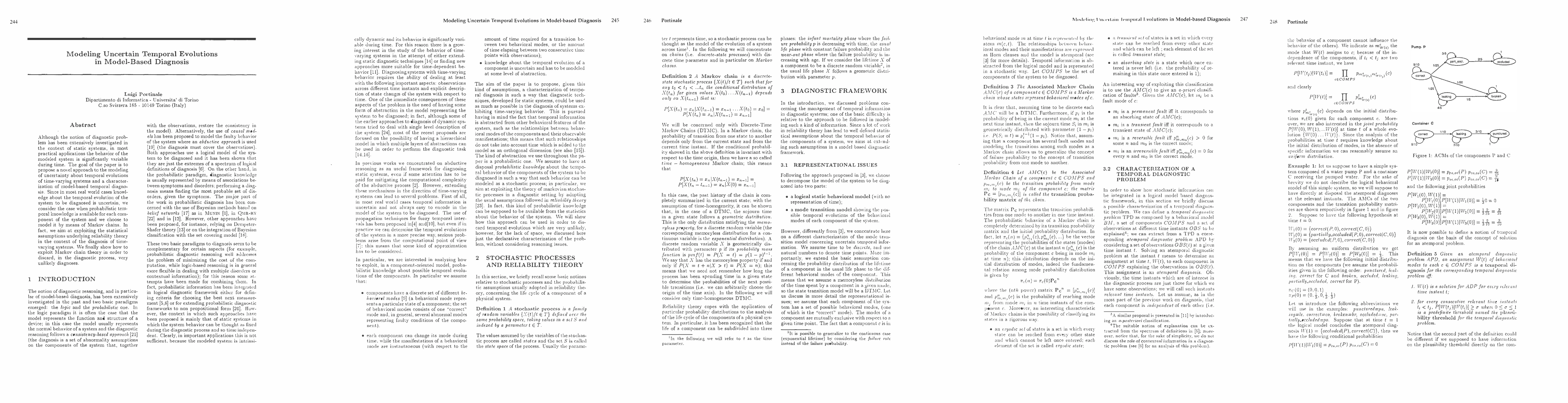 This paper proposes a novel approach to model uncertainty in the temporal evolutions of time-varying systems using Markov chains, aiming to characterize model-based temporal diagnosis and discard unlikely diagnoses based on statistical assumptions from reliability theory.