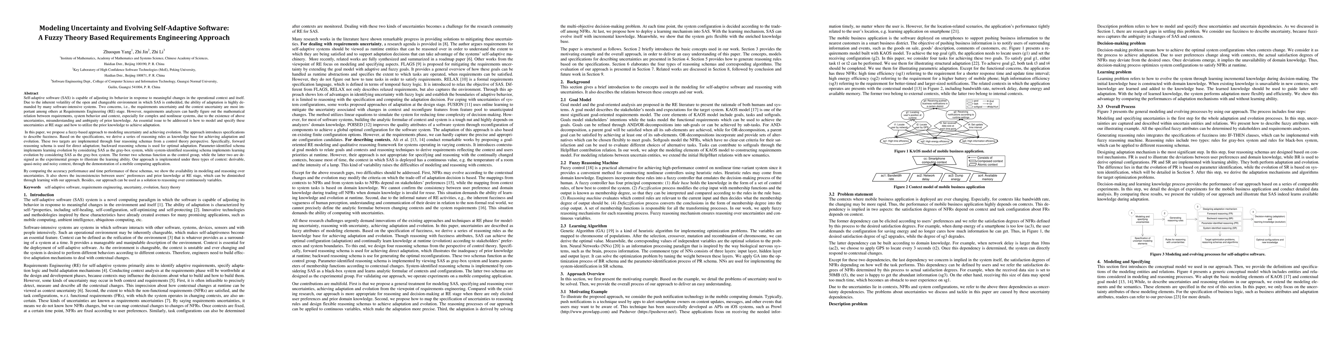 Self-adaptive software (SAS) is capable of adjusting its behavior in response to meaningful changes in the operational context and itself. Due to the inherent volatility of the open and changeable environment in which SAS is embedded, the ability of adaptation is highly demanded by many software-intensive systems. Two concerns, i.e., the requirements uncertainty and the context uncertainty are most important among others at Requirements Engineering (RE) stage. However, requirements analyzers can hardly figure out the mathematical relation between requirements, system behavior and context, especially for complex and nonlinear systems, due to the existence of above uncertainties, misunderstanding and ambiguity of prior knowledge. An essential issue to be addressed is how to model and specify these uncertainties at RE stage and how to utilize the prior knowledge to achieve adaptation. In this paper, we propose a fuzzy-based approach to modeling uncertainty and achieving evolution. The approach introduces specifications to describe fuzziness. Based on the specifications, we derive a series of reasoning rules as knowledge base for achieving adaptation and evolution. These two targets are implemented through four reasoning schemas from a control theory perspective. Specifically, forward reasoning schema is used for direct adaptation; backward reasoning schema is used for optimal adaptation. Parameter-identified schema implements learning evolution by considering SAS as the gray-box system, while system-identified reasoning schema implements learning evolution by considering SAS as the gray-box system. The former two schemas function as the control group, while the latter two are de-signed as the experimental groups to illustrate the learning ability. Our approach is implemented under three types of context through the demonstration of a mobile computing application.