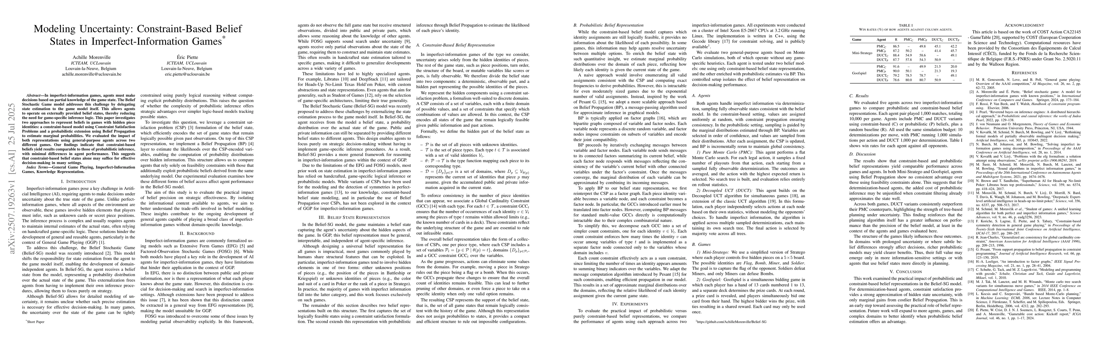 In imperfect-information games, agents must make decisions based on partial knowledge of the game state. The Belief Stochastic Game model addresses this challenge by delegating state estimation to the game model itself. This allows agents to operate on externally provided belief states, thereby reducing the need for game-specific inference logic. This paper investigates two approaches to represent beliefs in games with hidden piece identities: a constraint-based model using Constraint Satisfaction Problems and a probabilistic extension using Belief Propagation to estimate marginal probabilities. We evaluated the impact of both representations using general-purpose agents across two different games. Our findings indicate that constraint-based beliefs yield results comparable to those of probabilistic inference, with minimal differences in agent performance. This suggests that constraint-based belief states alone may suffice for effective decision-making in many settings.