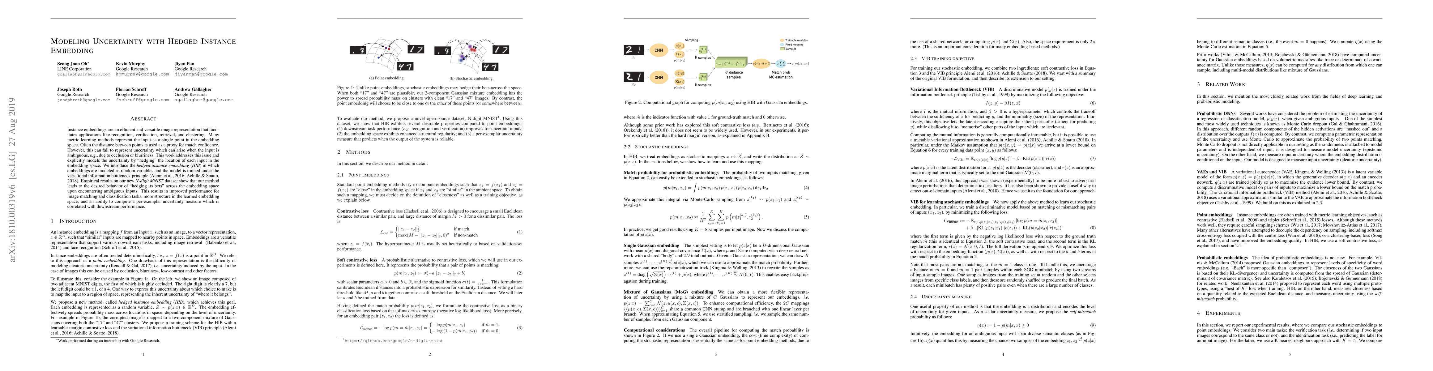 Instance embeddings are an efficient and versatile image representation that facilitates applications like recognition, verification, retrieval, and clustering. Many metric learning methods represent the input as a single point in the embedding space. Often the distance between points is used as a proxy for match confidence. However, this can fail to represent uncertainty arising when the input is ambiguous, e.g., due to occlusion or blurriness. This work addresses this issue and explicitly models the uncertainty by hedging the location of each input in the embedding space. We introduce the hedged instance embedding (HIB) in which embeddings are modeled as random variables and the model is trained under the variational information bottleneck principle. Empirical results on our new N-digit MNIST dataset show that our method leads to the desired behavior of hedging its bets across the embedding space upon encountering ambiguous inputs. This results in improved performance for image matching and classification tasks, more structure in the learned embedding space, and an ability to compute a per-exemplar uncertainty measure that is correlated with downstream performance.