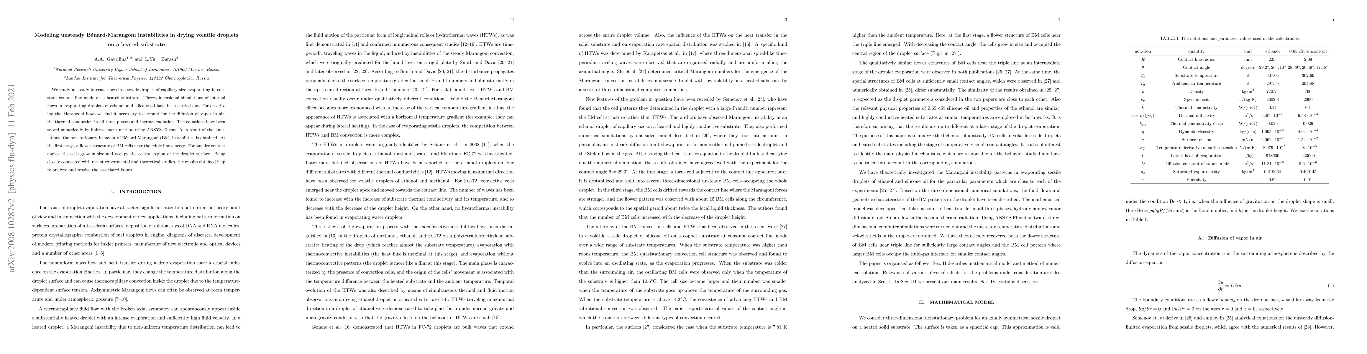 We study unsteady internal flows in a sessile droplet of capillary size evaporating in constant contact line mode on a heated substrate. Three-dimensional simulations of internal flows in evaporating droplets of ethanol and silicone oil have been carried out. For describing the Marangoni flows we find it necessary to account for the diffusion of vapor in air, the thermal conduction in all three phases and thermal radiation. The equations have been solved numerically by finite element method using ANSYS Fluent. As a result of the simulations, the nonstationary behavior of B\'enard-Marangoni (BM) instabilities is obtained. At the first stage, a flower structure of BM cells near the triple line emerge. For smaller contact angles, the cells grow in size and occupy the central region of the droplet surface. Being closely connected with recent experimental and theoretical studies, the results obtained help to analyze and resolve the associated issues.